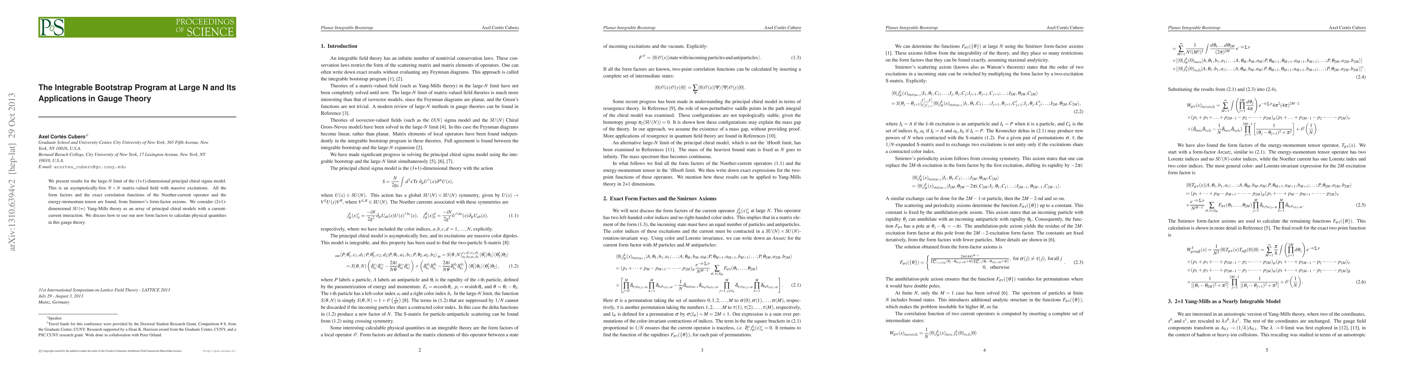 We present results for the large-$N$ limit of the (1+1)-dimensional principal chiral sigma model. This is an asymptotically-free $N\times N$ matrix-valued field with massive excitations. All the form factors and the exact correlation functions of the Noether-current operator and the energy-momentum tensor are found, from Smirnov's form-factor axioms. We consider (2+1)-dimensional $SU(\infty)$ Yang-Mills theory as an array of principal chiral models with a current-current interaction. We discuss how to use our new form factors to calculate physical quantities in this gauge theory.