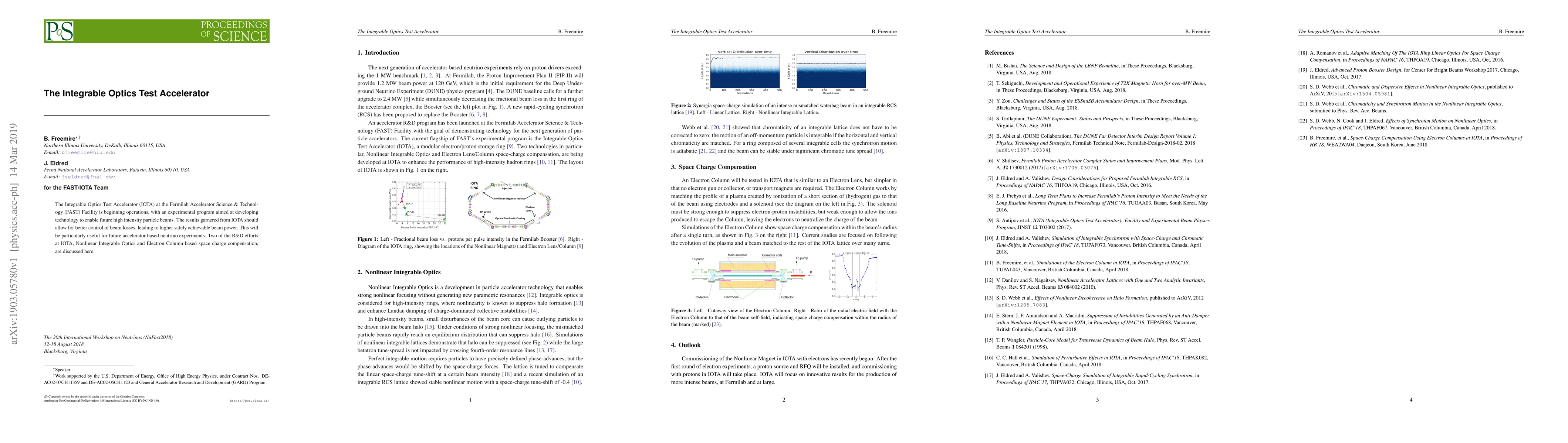 The Integrable Optics Test Accelerator (IOTA) at the Fermilab Accelerator Science & Technology (FAST) Facility is beginning operations, with an experimental program aimed at developing technology to enable future high intensity particle beams. The results garnered from IOTA should allow for better control of beam losses, leading to higher safely achievable beam power. This will be particularly useful for future accelerator based neutrino experiments. Two of the R&D efforts at IOTA, Nonlinear Integrable Optics and Electron Column-based space charge compensation, are discussed here.
