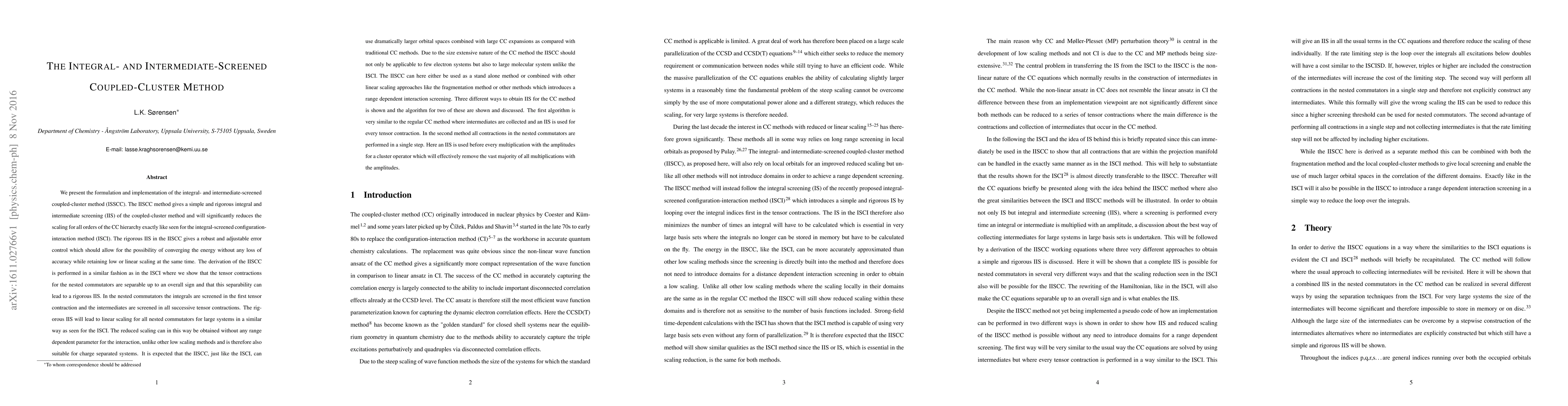 We present the formulation and implementation of the integral- and intermediate-screened coupled-cluster method (ISSCC). The IISCC method gives a simple and rigorous integral and intermediate screening (IIS) of the coupled-cluster method and will significantly reduces the scaling for all orders of the CC hierarchy exactly like seen for the integral-screened configuration-interaction method (ISCI). The rigorous IIS in the IISCC gives a robust and adjustable error control which should allow for the possibility of converging the energy without any loss of accuracy while retaining low or linear scaling at the same time. The derivation of the IISCC is performed in a similar fashion as in the ISCI where we show that the tensor contractions for the nested commutators are separable up to an overall sign and that this separability can lead to a rigorous IIS. In the nested commutators the integrals are screened in the first tensor contraction and the intermediates are screened in all successive tensor contractions. The rigorous IIS will lead to linear scaling for all nested commutators for large systems in a similar way as seen for the ISCI. The reduced scaling can in this way be obtained without any range dependent parameter for the interaction, unlike other low scaling methods and is therefore also suitable for charge separated systems. It is expected that the IISCC, just like the ISCI, can use dramatically larger orbital spaces combined with large CC expansions as compared with traditional CC methods. Due to the size extensive nature of the CC method the IISCC should not only be applicable to few electron systems but also to large molecular system unlike the ISCI. The IISCC can here either be used as a stand alone method or combined with other linear scaling approaches like the fragmentation method or other methods which introduces a range dependent interaction screening.