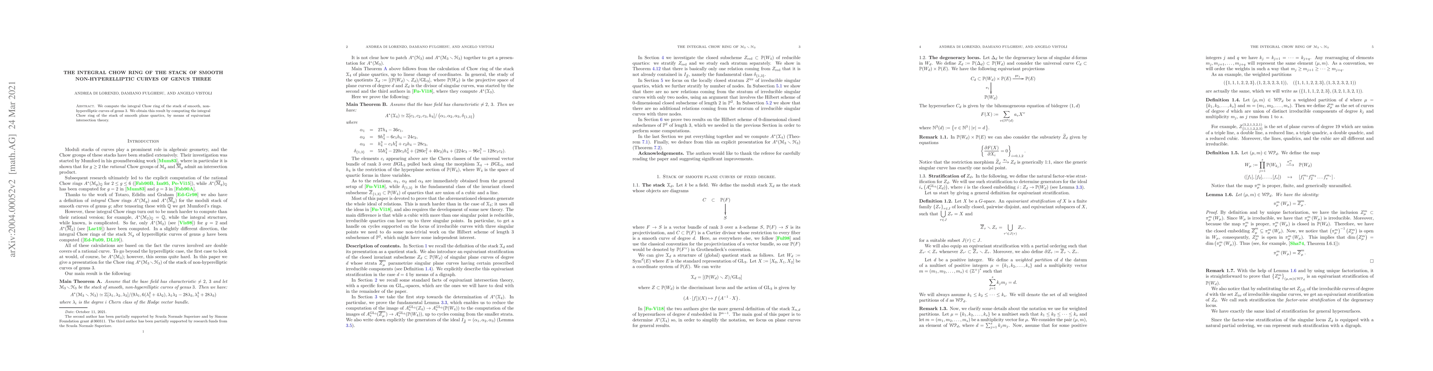 Summary: The research computes the integral Chow ring of the stack of smooth, non-hyperelliptic genus three curves, achieving this by determining the integral Chow ring of the stack of smooth plane quartics using equivariant intersection theory.