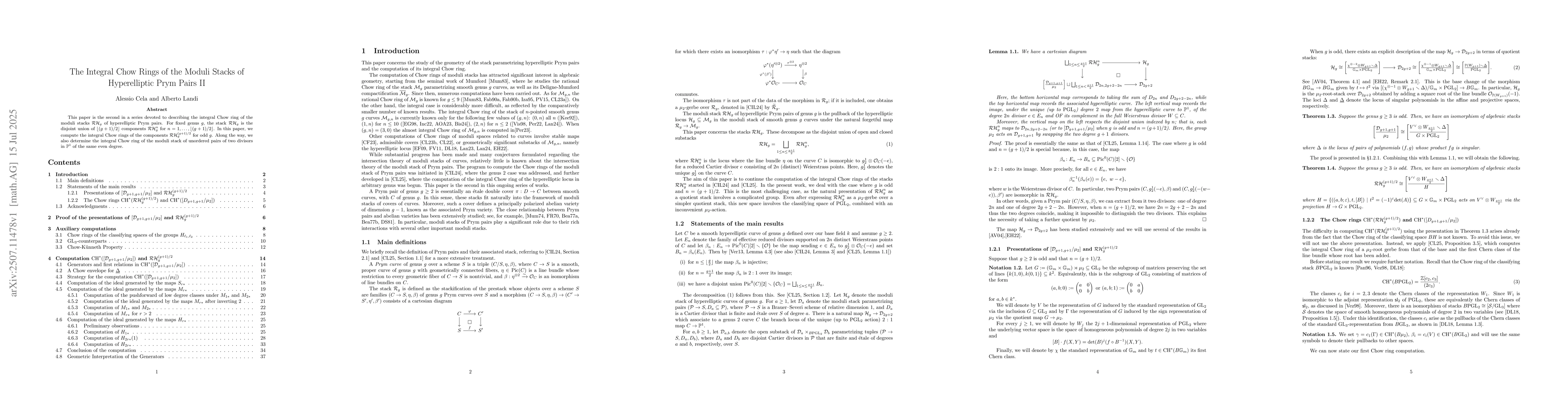 This paper is the second in a series devoted to describing the integral Chow ring of the moduli stacks $\mathcal{RH}_g$ of hyperelliptic Prym pairs. For fixed genus $g$, the stack $\mathcal{RH}_g$ is the disjoint union of $\lfloor (g+1)/2 \rfloor$ components $\mathcal{RH}_g^n$ for $n = 1, \ldots, \lfloor (g+1)/2 \rfloor$. In this paper, we compute the integral Chow rings of the components $\mathcal{RH}_g^{(g+1)/2}$ for odd $g$. Along the way, we also determine the integral Chow ring of the moduli stack of unordered pairs of two divisors in $\mathbb{P}^1$ of the same even degree.
