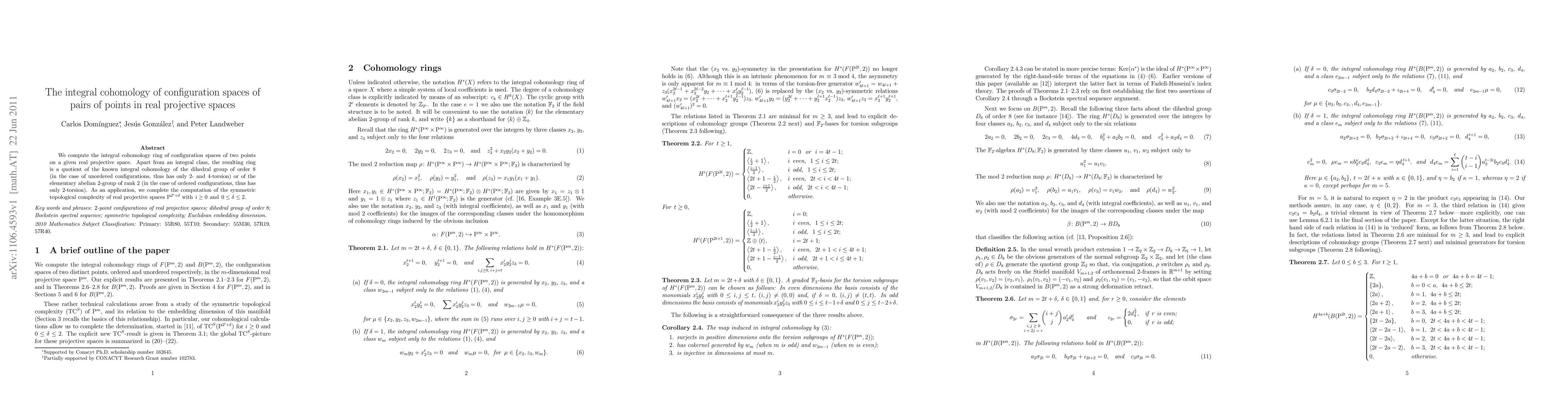 The paper computes the integral cohomology ring of configuration spaces of two points in real projective spaces, showing it to be a quotient of the known cohomology of dihedral or elementary abelian groups, and applies this to determine the symmetric topological complexity for certain dimensions of real projective spaces.