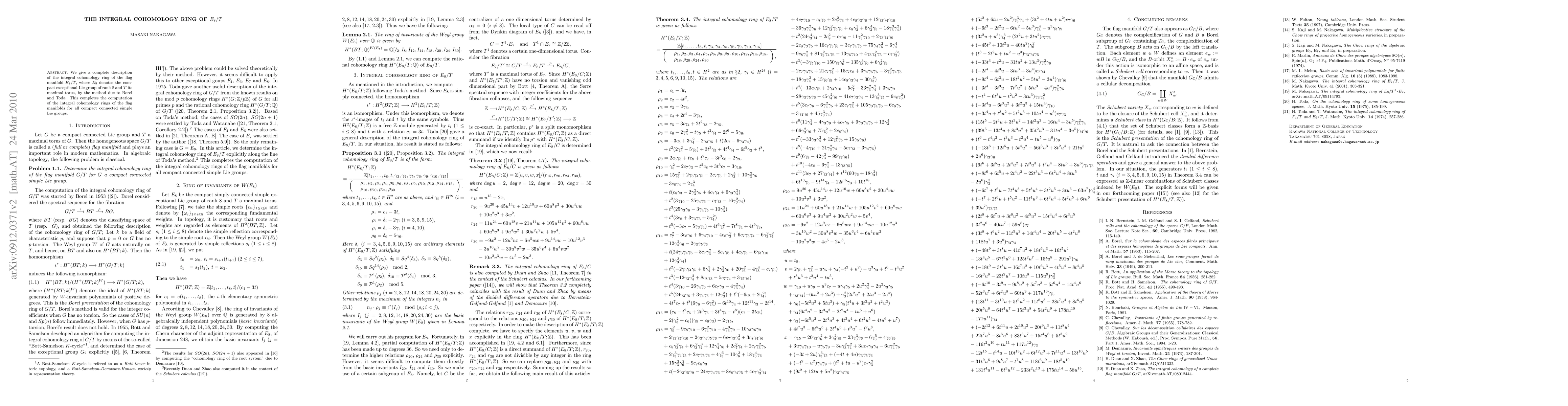 This paper provides a complete description of the integral cohomology ring of the flag manifold E_8/T using Borel and Toda's method, completing the computation for all compact connected simple Lie groups' flag manifolds.