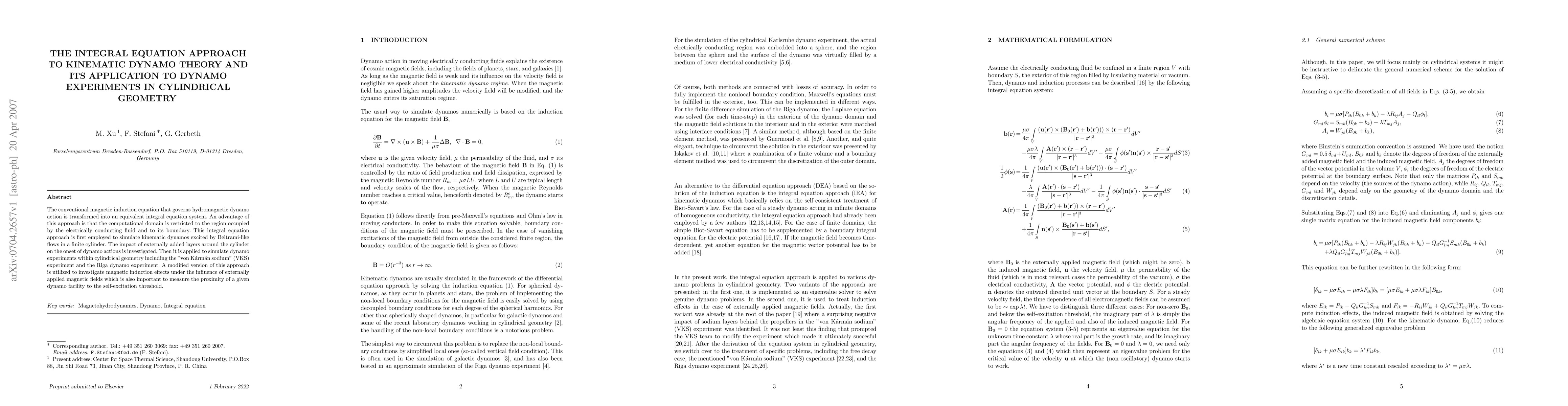 This paper presents an integral equation approach to simplify kinematic dynamo theory simulations, focusing on cylindrical geometries. It investigates dynamo actions driven by Beltrami-like flows, impact of external layers, and compares results with VKS and Riga dynamo experiments. The method also explores magnetic induction effects under external fields, aiding in assessing dynamo facilities' proximity to self-excitation thresholds.