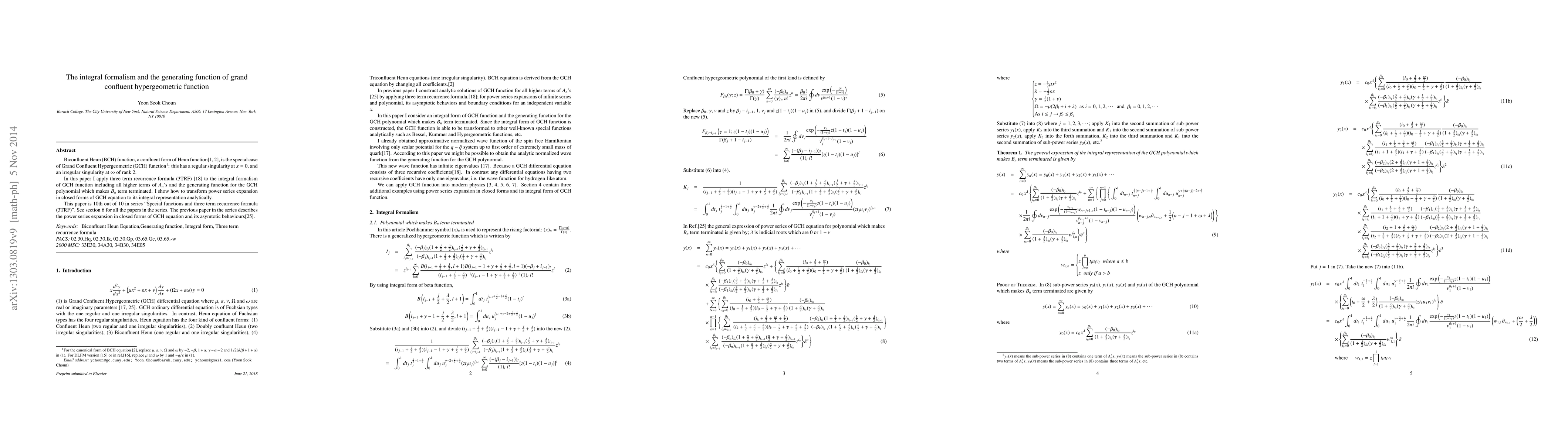 Biconfluent Heun (BCH) function, a confluent form of Heun function, is the special case of Grand Confluent Hypergeometric (GCH) function: this has a regular singularity at x=0, and an irregular singularity at infinity of rank 2. In this paper I apply three term recurrence formula (3TRF) [arXiv:1303.0806] to the integral formalism of GCH function including all higher terms of A_n's and the generating function for the GCH polynomial which makes B_n term terminated. I show how to transform power series expansion in closed forms of GCH equation to its integral representation analytically. This paper is 10th out of 10 in series "Special functions and three term recurrence formula (3TRF)". See section 6 for all the papers in the series. The previous paper in the series describes the power series expansion in closed forms of GCH equation and its asymtotic behaviours. [arXiv:1303.0813]