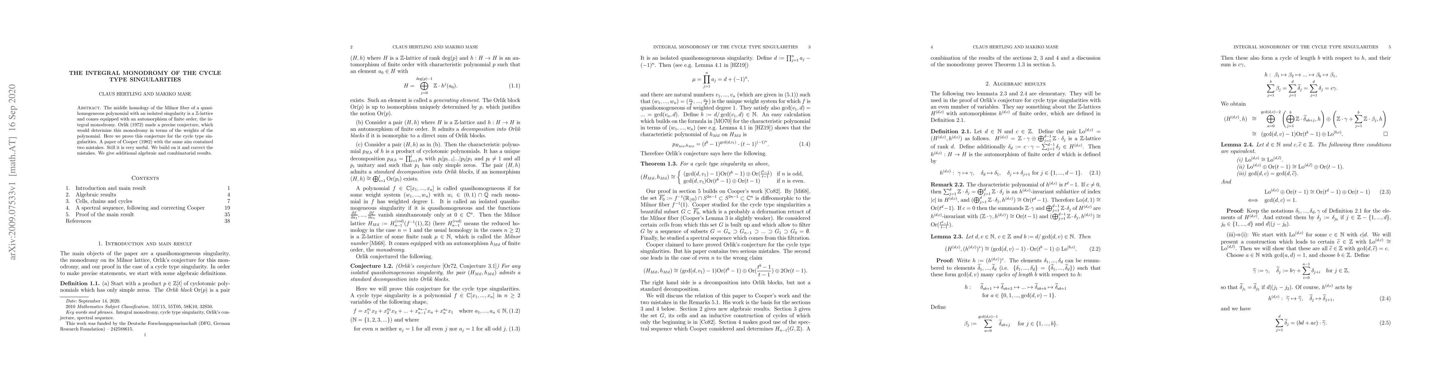 This paper proves Orlik's 1972 conjecture on the integral monodromy of cycle type singularities of quasihomogeneous polynomials, correcting errors in a prior study by Cooper (1982) and providing new algebraic and combinatorial results.