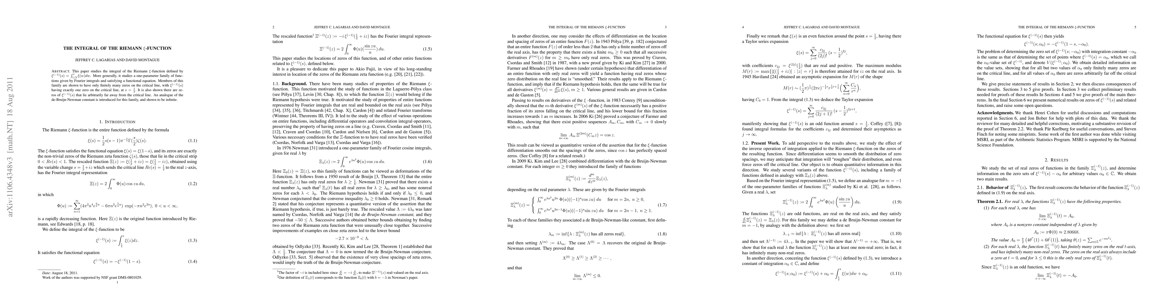 This paper studies the integral of the Riemann xi-function. More generally, it studies a one-parameter family of functions given by Fourier integrals and satisfying a functional equation. Members of this family are shown to have only finitely many zeros on the critical line, with the integral of the Riemann xi-function having exactly one zero on the critical line, at s = 1/2. The zeros of the integral of the xi-function are shown to lie arbitrarily far away from the critical line. An analogue of the de Bruijn-Newman constant is introduced for this family, and shown to be infinite.
