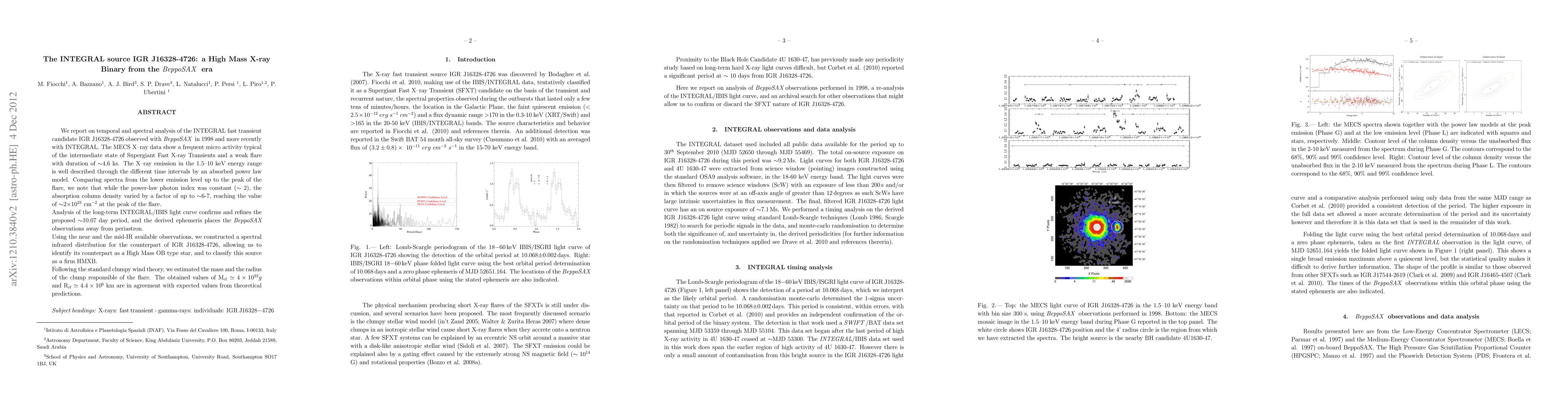 We report on temporal and spectral analysis of the INTEGRAL fast transient candidate IGR J16328-4726 observed with Beppo SAX in 1998 and more recently with INTEGRAL. The MECS X-ray data show a frequent micro activity typical of the intermediate state of Supergiant Fast X-ray Transients and a weak flare with duration of ~4.6 ks. The X-ray emission in the 1.5-10 keV energy range is well described through the different time intervals by an absorbed power law model. Comparing spectra from the lower emission level up to the peak of the flare, we note that while the power-law photon index was constant (~2), the absorption column density varied by a factor of up to ~6-7, reaching the value of ~2x10^{23}cm^{-2} at the peak of the flare. Analysis of the long-term INTEGRAL/IBIS light curve confirms and refines the proposed ~10.07 day period, and the derived ephemeris places the Beppo SAX observations away from periastron. Using the near and the mid-IR available observations, we constructed a spectral infrared distribution for the counterpart of IGR J16328-4726, allowing us to identify its counterpart as a High Mass OB type star, and to classify this source as a firm HMXB. Following the standard clumpy wind theory, we estimated the mass and the radius of the clump responsible of the flare. The obtained values of M~4x10^{22}g and R~4.4x10^6 km are in agreement with expected values from theoretical predictions.