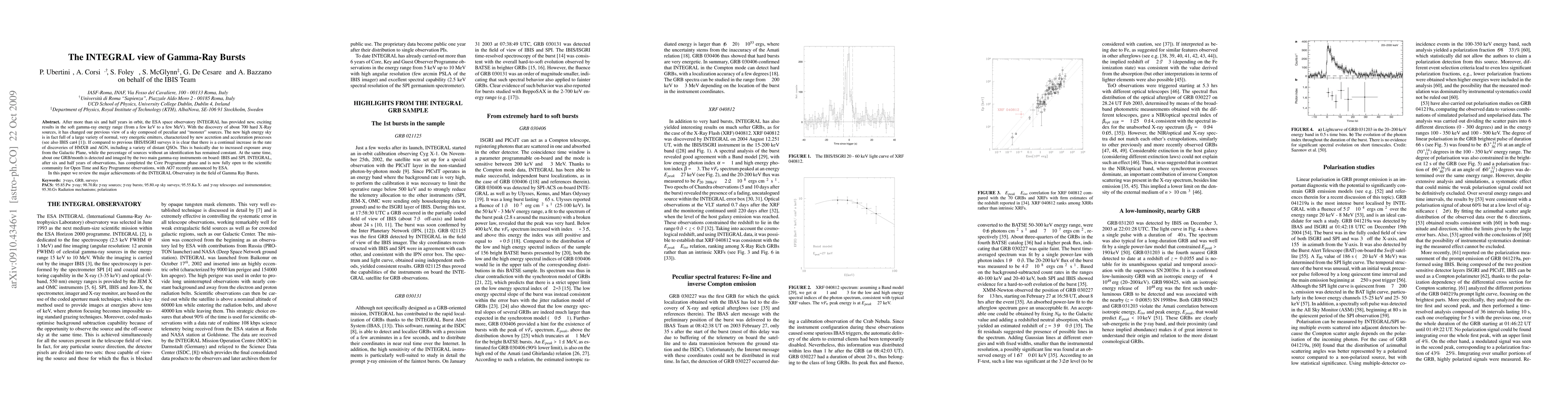 After more than six and half years in orbit, the ESA space observatory INTEGRAL has provided new, exciting results in the soft gamma-ray energy range (from a few keV to a few MeV). With the discovery of about 700 hard X-Ray sources, it has changed our previous view of a sky composed of peculiar and ``monster'' sources. The new high energy sky is in fact full of a large variety of normal, very energetic emitters, characterized by new accretion and acceleration processes (see also IBIS cat4, Bird et al. 2009). If compared to previous IBIS/ISGRI surveys it is clear that there is a continual increase in the rate of discoveries of HMXB and AGN, including a variety of distant QSOs. This is basically due to increased exposure away from the Galactic Plane, while the percentage of sources without an identification has remained constant. At the same time, about one GRB/month is detected and imaged by the two main gamma-ray instruments on board: IBIS and SPI. INTEGRAL, after six and half years of observations, has completed the Core Programme phase and is now fully open to the scientific community for Open Time and Key Programme observations, with AO7 recently announced by ESA. In this paper we review the major achievements of the INTEGRAL Observatory in the field of Gamma Ray Bursts.