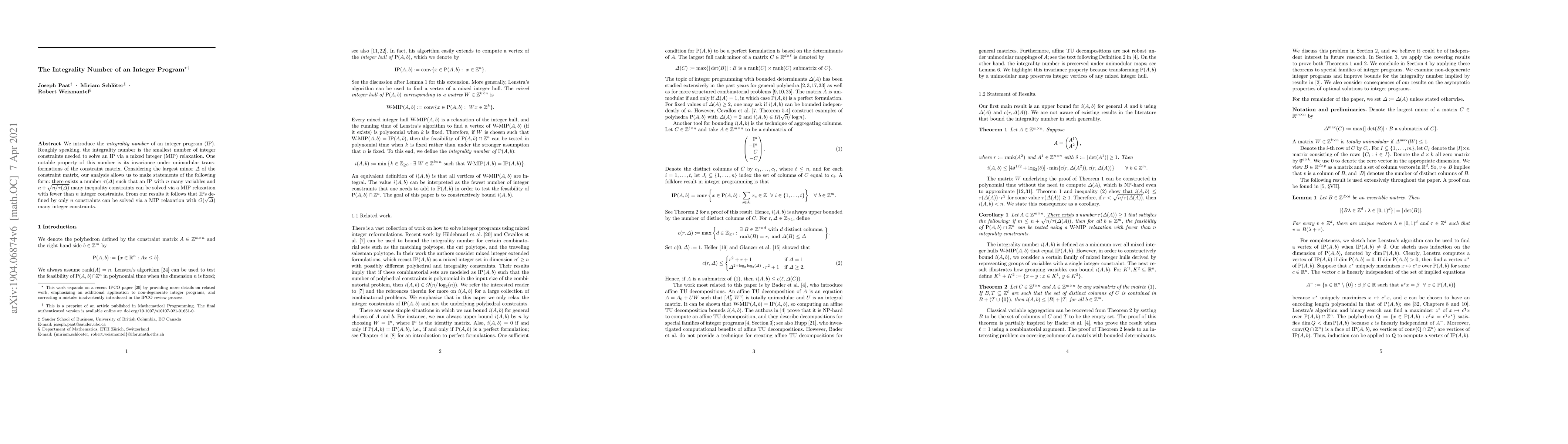 This research paper introduces the concept of integrality number for integer programs, showing that certain programs can be solved with a relatively small number of integer constraints via mixed-integer relaxation.