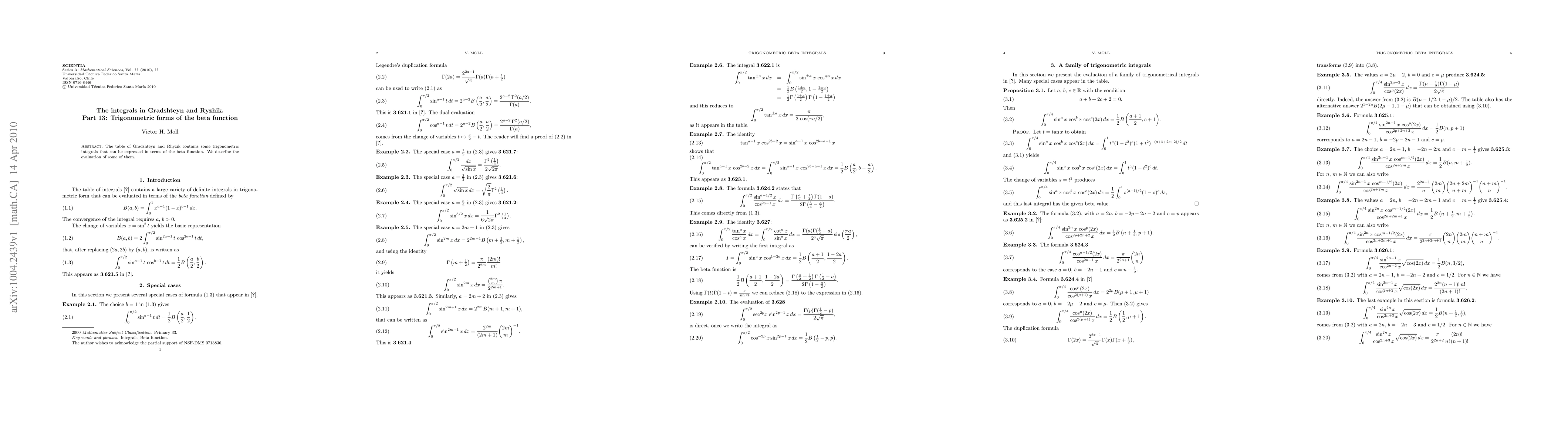 The paper describes the evaluation of certain trigonometric integrals in terms of the beta function, utilizing Legendre's duplication formula and various variable transformations.