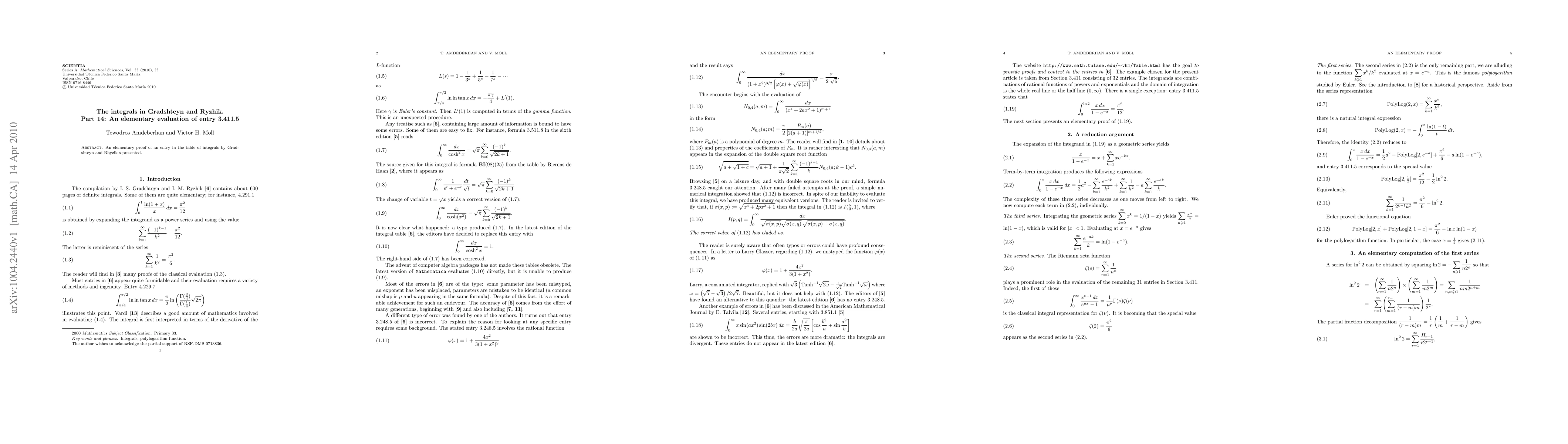 The paper presents an elementary proof for an entry in Gradshteyn and Ryzhik's integral table, specifically entry 3.411.5, using a reduction argument and properties of the Riemann zeta function and polylogarithm.