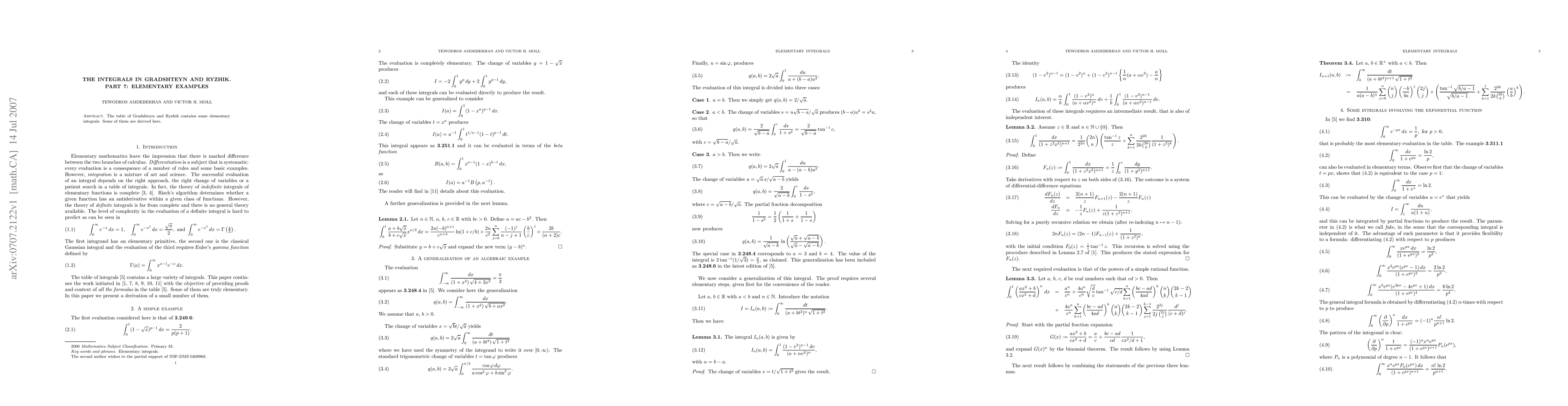 The paper discusses the evaluations of elementary integrals found in Gradshteyn and Ryzhik's classical table of integrals, focusing on specific integrals involving exponential functions, polynomials, and logarithms.