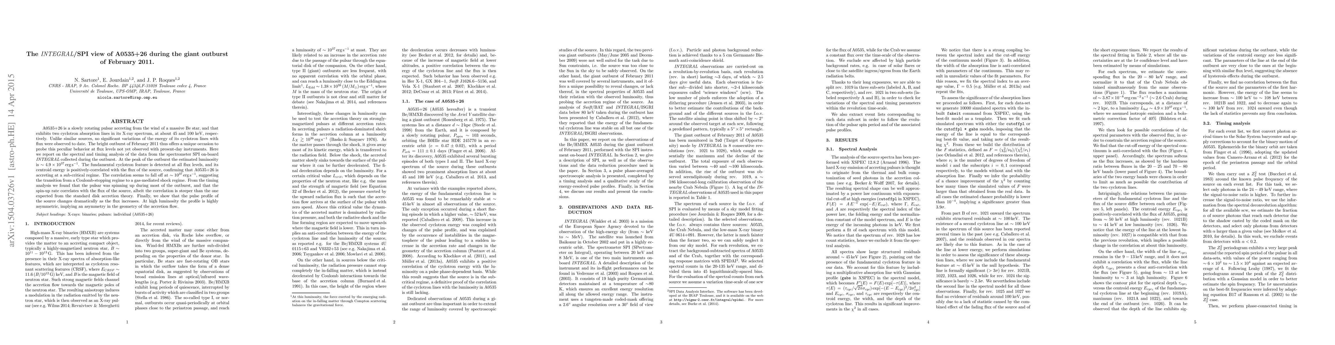 A0535+26 is a slowly rotating pulsar accreting from the wind of a massive Be star, and that exhibits two cyclotron absorption lines in its X-ray spectrum, at about 45 and 100 keV, respectively. Unlike similar sources, no significant variations of the energy of its cyclotron lines with flux were observed to date. The bright outburst of February 2011 thus offers a unique occasion to probe this peculiar behavior at flux levels not yet observed with present-day instruments. Here we report on the spectral and timing analysis of the data from the spectrometer SPI on-board INTEGRAL collected during the outburst. At the peak of the outburst the estimated luminosity is ~4.9x10^37 erg/s. The fundamental cyclotron feature is detected at all flux levels, and its centroid energy is positively-correlated with the flux of the source, confirming that A0535+26 is accreting at a sub-critical regime. The correlation seems to fall off at ~10^37 erg/s, suggesting the transition from a Coulomb-stopping regime to a gas-mediated shock regime. From the timing analysis we found that the pulsar was spinning up during most of the outburst, and that the spin-up rate correlates with the flux of the source, albeit the correlation is steeper than the one expected from the standard disk accretion theory. Finally, we show that the pulse profile of the source changes dramatically as the flux increases. At high luminosity the profile is highly asymmetric, implying an asymmetry in the geometry of the accretion flow.