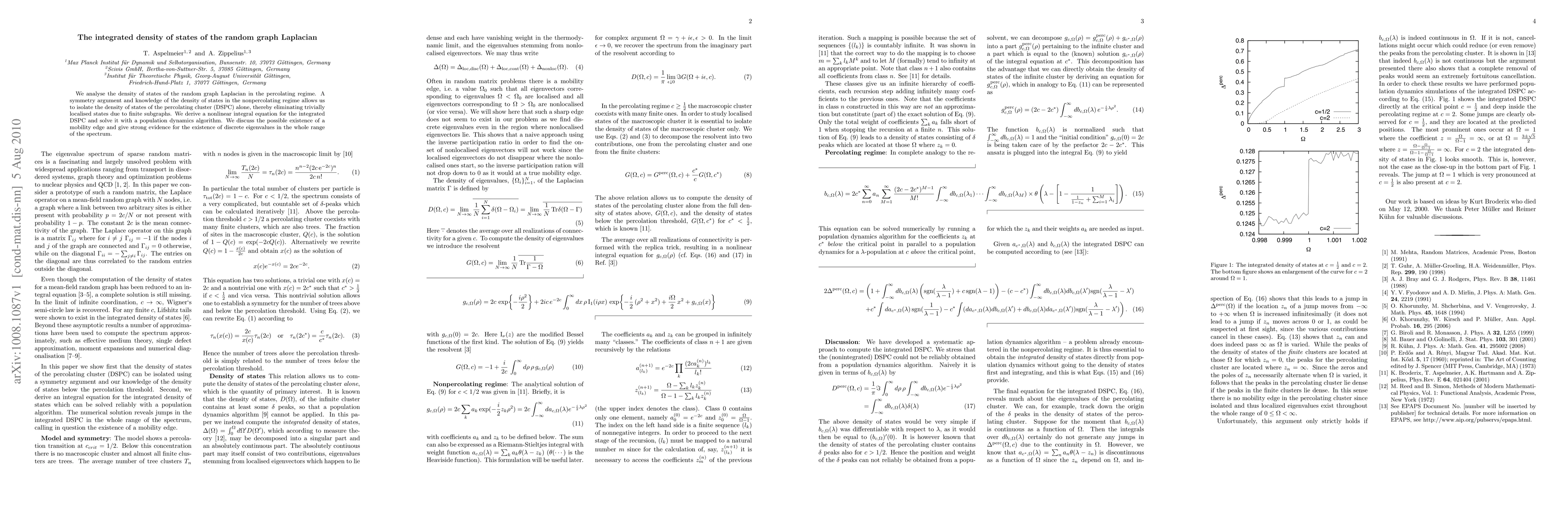 This paper investigates the density of states of the random graph Laplacian in the percolating regime, deriving a nonlinear integral equation for the integrated density of states of the percolating cluster and solving it using a population dynamics algorithm. It provides strong evidence for the existence of a mobility edge and discrete eigenvalues throughout the spectrum.