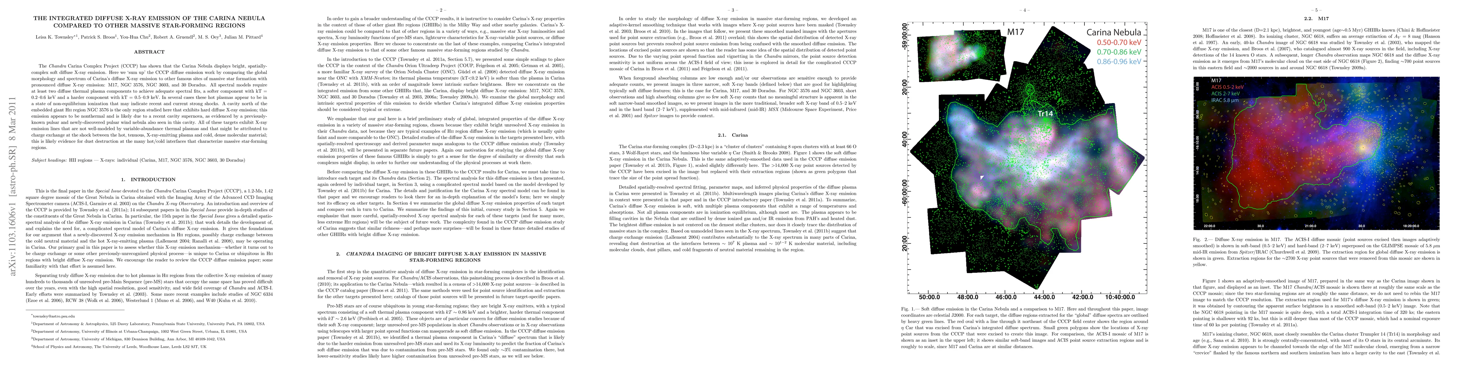 The Chandra Carina Complex Project reveals that the Carina Nebula's diffuse X-ray emission features complex morphology and spectrum, comparable to other massive star-forming regions like M17, NGC 3576, NGC 3603, and 30 Doradus. Both regions exhibit dual thermal plasma components and non-equilibrium ionization, suggesting recent strong shocks.