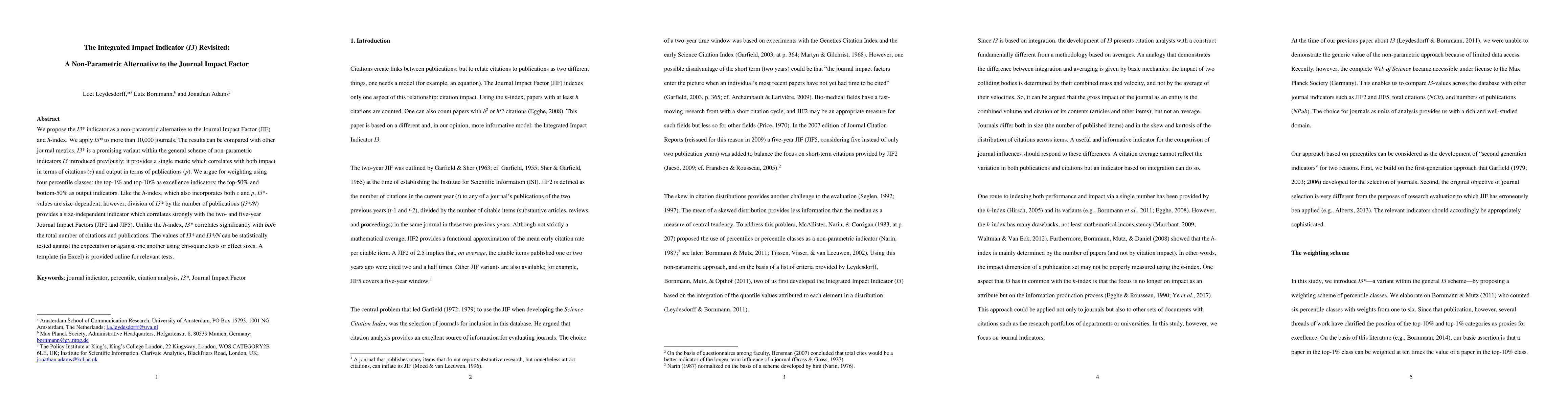 The paper proposes the I3* indicator as a non-parametric alternative to the Journal Impact Factor and h-index, showing it correlates with both citations and publications. Unlike the h-index, I3* correlates significantly with both total citations and publication numbers, and a size-independent version (I3*/N) correlates strongly with two- and five-year Impact Factors.