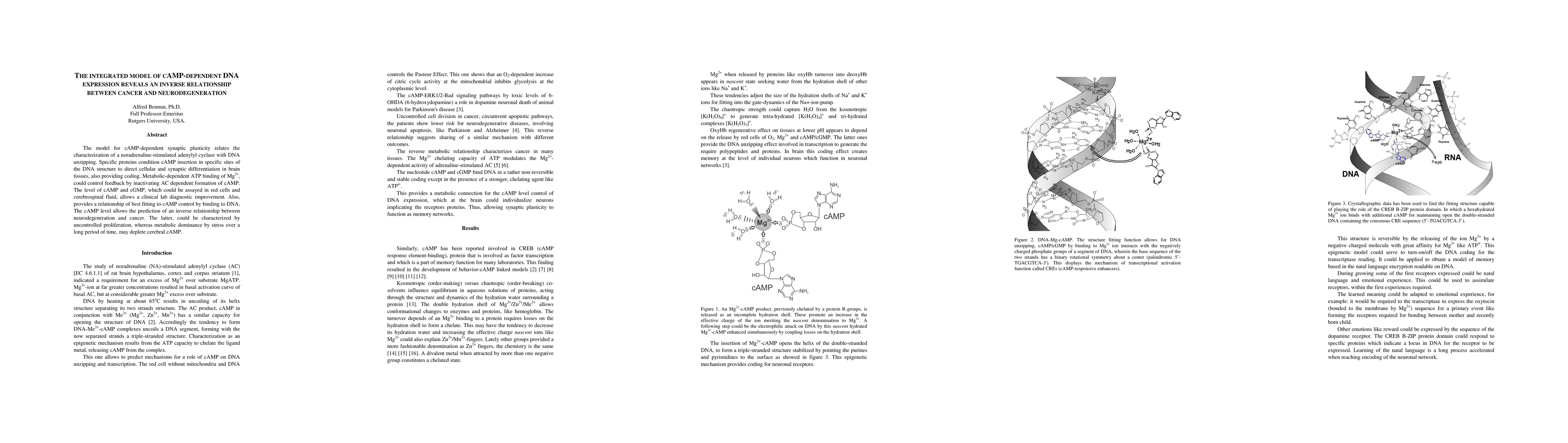 The model for cAMP-dependent synaptic plasticity relates the characterization of a noradrenaline-stimulated adenylyl cyclase with DNA unzipping. Specific proteins condition cAMP insertion in specific sites of the DNA structure to direct cellular and synaptic differentiation in brain tissues, also providing coding. Metabolic-dependent ATP binding of Mg2+, could control feedback by inactivating AC dependent formation of cAMP. The level of cAMP and cGMP, which could be assayed in red cells and cerebrospinal fluid, allows a clinical lab diagnostic improvement. Also, provides a relationship of best fitting to cAMP control by binding to DNA. The cAMP level allows the prediction of an inverse relationship between neurodegeneration and cancer. The latter, could be characterized by uncontrolled proliferation, whereas metabolic dominance by stress over a long period of time, may deplete cerebral cAMP.