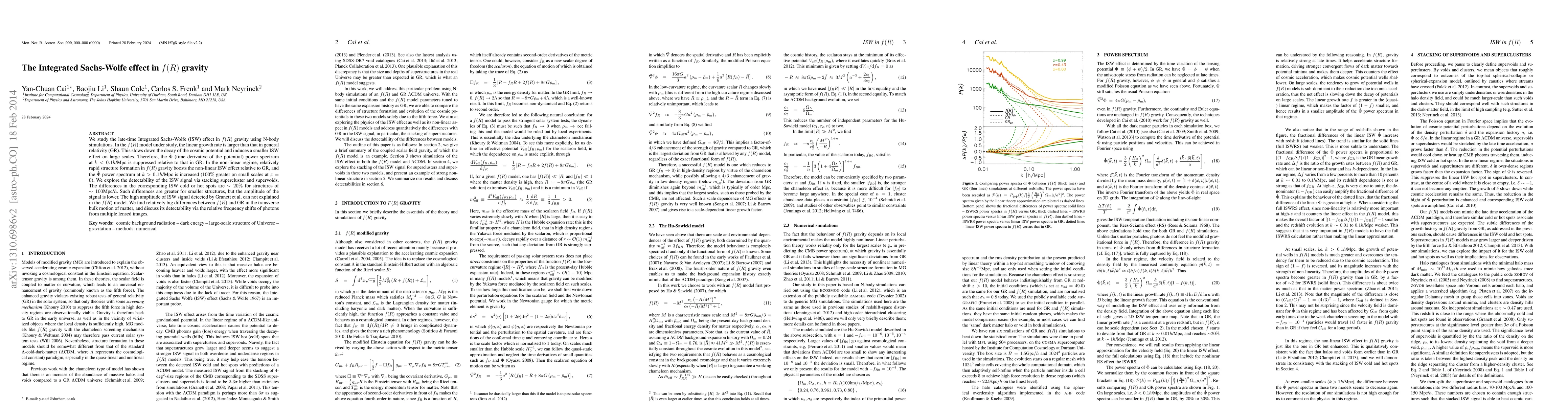 We study the late-time Integrated Sachs-Wolfe (ISW) effect in $f(R)$ gravity using N-body simulations. In the $f(R)$ model under study, the linear growth rate is larger than that in general relativity (GR). This slows down the decay of the cosmic potential and induces a smaller ISW effect on large scales. Therefore, the $\dot\Phi$ (time derivative of the potential) power spectrum at $k<0.1h$/Mpc is suppressed relative to that in GR. In the non-linear regime, relatively rapid structure formation in $f(R)$ gravity boosts the non-linear ISW effect relative to GR, and the $\dot\Phi$ power spectrum at $k>0.1h$/Mpc is increased (100$\%$ greater on small scales at $z=0$). We explore the detectability of the ISW signal via stacking supercluster and supervoids. The differences in the corresponding ISW cold or hot spots are $\sim 20\%$ for structures of $\sim 100$Mpc/$h$. Such differences are greater for smaller structures, but the amplitude of the signal is lower. The high amplitude of ISW signal detected by Granett et al. can not explained in the $f(R)$ model. We find relatively big differences between $f(R)$ and GR in the transverse bulk motion of matter, and discuss its detectability via the relative frequency shifts of photons from multiple lensed images.