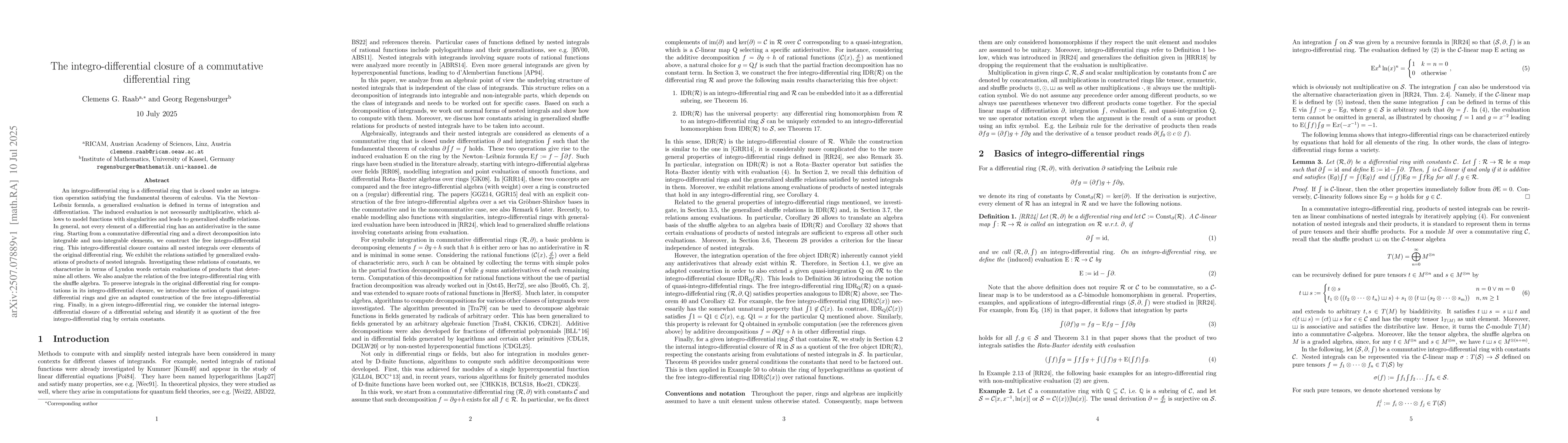 An integro-differential ring is a differential ring that is closed under an integration operation satisfying the fundamental theorem of calculus. Via the Newton--Leibniz formula, a generalized evaluation is defined in terms of integration and differentiation. The induced evaluation is not necessarily multiplicative, which allows to model functions with singularities and leads to generalized shuffle relations. In general, not every element of a differential ring has an antiderivative in the same ring. Starting from a commutative differential ring and a direct decomposition into integrable and non-integrable elements, we construct the free integro-differential ring. This integro-differential closure contains all nested integrals over elements of the original differential ring. We exhibit the relations satisfied by generalized evaluations of products of nested integrals. Investigating these relations of constants, we characterize in terms of Lyndon words certain evaluations of products that determine all others. We also analyze the relation of the free integro-differential ring with the shuffle algebra. To preserve integrals in the original differential ring for computations in its integro-differential closure, we introduce the notion of quasi-integro-differential rings and give an adapted construction of the free integro-differential ring. Finally, in a given integro-differential ring, we consider the internal integro-differential closure of a differential subring and identify it as quotient of the free integro-differential ring by certain constants.