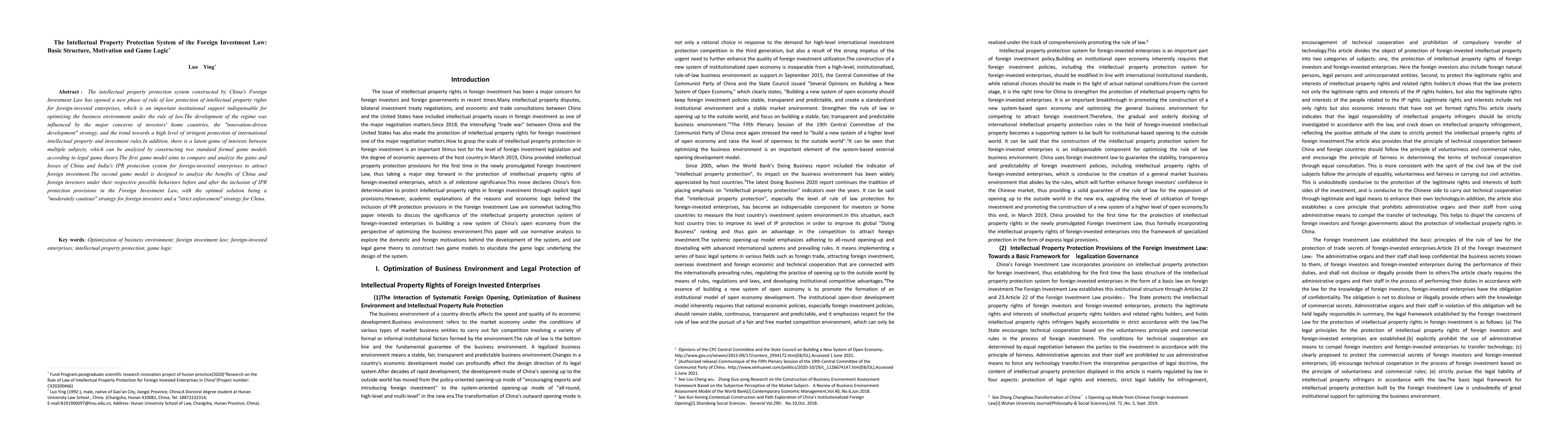This paper examines China's Foreign Investment Law's intellectual property protection system, highlighting its structure, motivation, and strategic implications. It analyzes the interplay of interests through formal game models, suggesting optimal strategies for both China and foreign investors to maximize benefits.