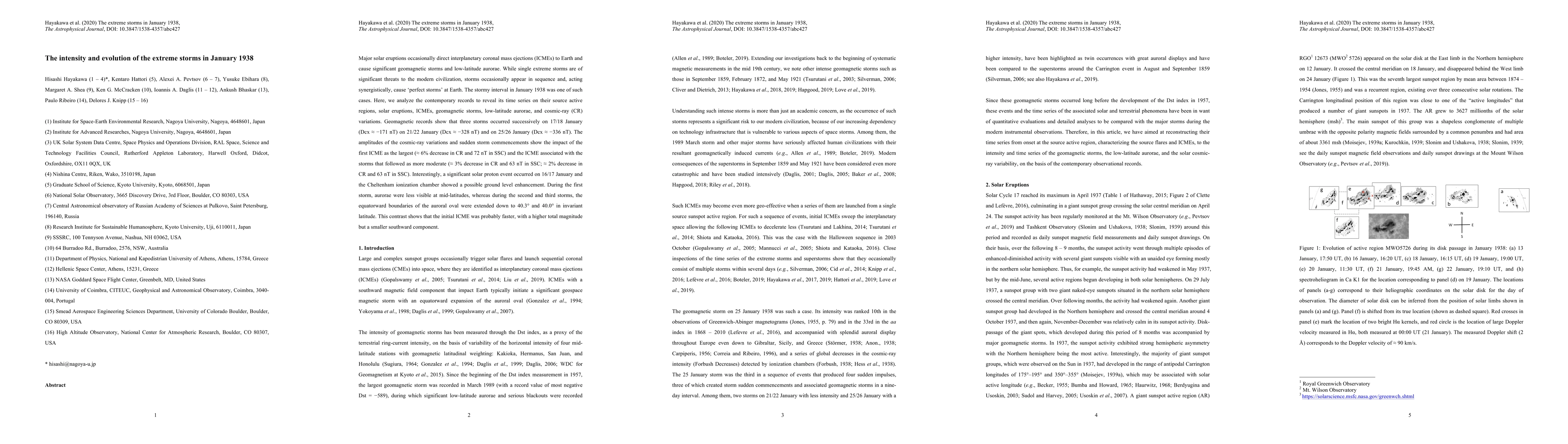 Major solar eruptions occasionally direct interplanetary coronal mass ejections (ICMEs) to Earth and cause significant geomagnetic storms and low-latitude aurorae. While single extreme storms are of significant threats to the modern civilization, storms occasionally appear in sequence and, acting synergistically, cause 'perfect storms' at Earth. The stormy interval in January 1938 was one of such cases. Here, we analyze the contemporary records to reveal its time series on their source active regions, solar eruptions, ICMEs, geomagnetic storms, low-latitude aurorae, and cosmic-ray (CR) variations. Geomagnetic records show that three storms occurred successively on 17/18 January (Dcx ~ -171 nT) on 21/22 January (Dcx ~ -328 nT) and on 25/26 January (Dcx ~ -336 nT). The amplitudes of the cosmic-ray variations and sudden storm commencements show the impact of the first ICME as the largest (~ 6% decrease in CR and 72 nT in SSC) and the ICME associated with the storms that followed as more moderate (~ 3% decrease in CR and 63 nT in SSC; ~ 2% decrease in CR and 63 nT in SSC). Interestingly, a significant solar proton event occurred on 16/17 January and the Cheltenham ionization chamber showed a possible ground level enhancement. During the first storm, aurorae were less visible at mid-latitudes, whereas during the second and third storms, the equatorward boundaries of the auroral oval were extended down to 40.3{\deg} and 40.0{\deg} in invariant latitude. This contrast shows that the initial ICME was probably faster, with a higher total magnitude but a smaller southward component.