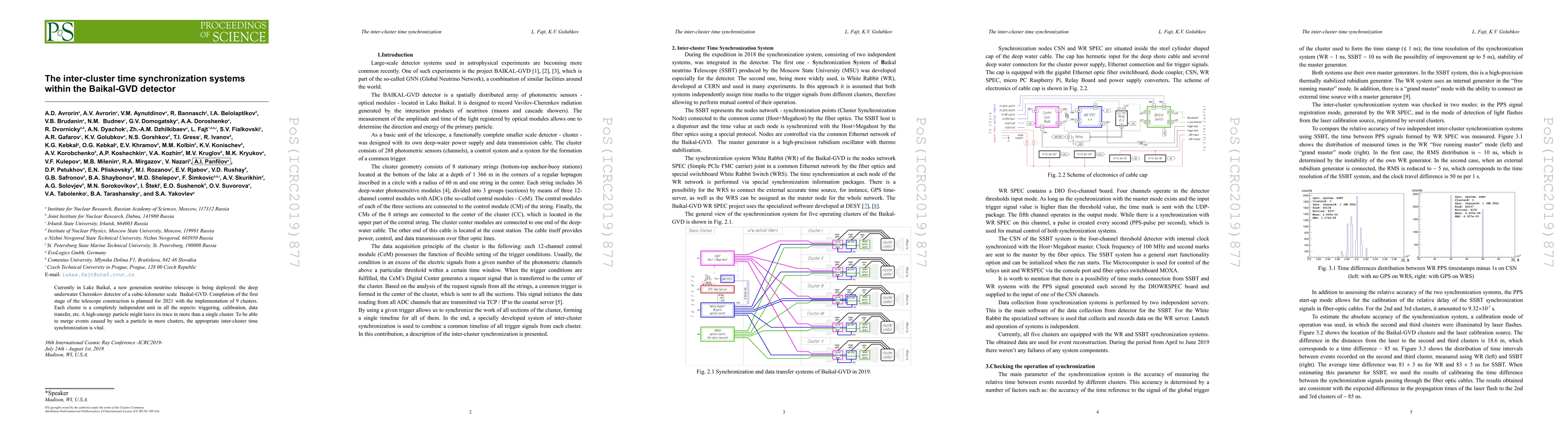 A new neutrino telescope in Lake Baikal uses 9 independent clusters that may overlap with each other when detecting high-energy particles. The paper focuses on the importance of inter-cluster time synchronization to accurately merge events from multiple clusters.