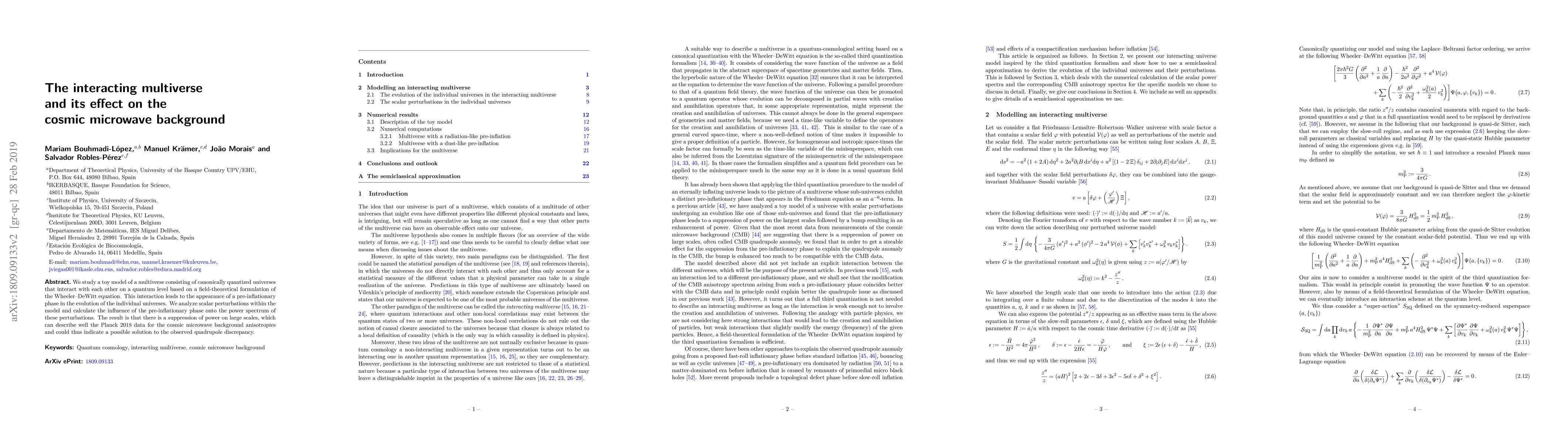 We study a toy model of a multiverse consisting of canonically quantized universes that interact with each other on a quantum level based on a field-theoretical formulation of the Wheeler-DeWitt equation. This interaction leads to the appearance of a pre-inflationary phase in the evolution of the individual universes. We analyze scalar perturbations within the model and calculate the influence of the pre-inflationary phase onto the power spectrum of these perturbations. The result is that there is a suppression of power on large scales, which can describe well the Planck 2018 data for the cosmic microwave background anisotropies and could thus indicate a possible solution to the observed quadrupole discrepancy.