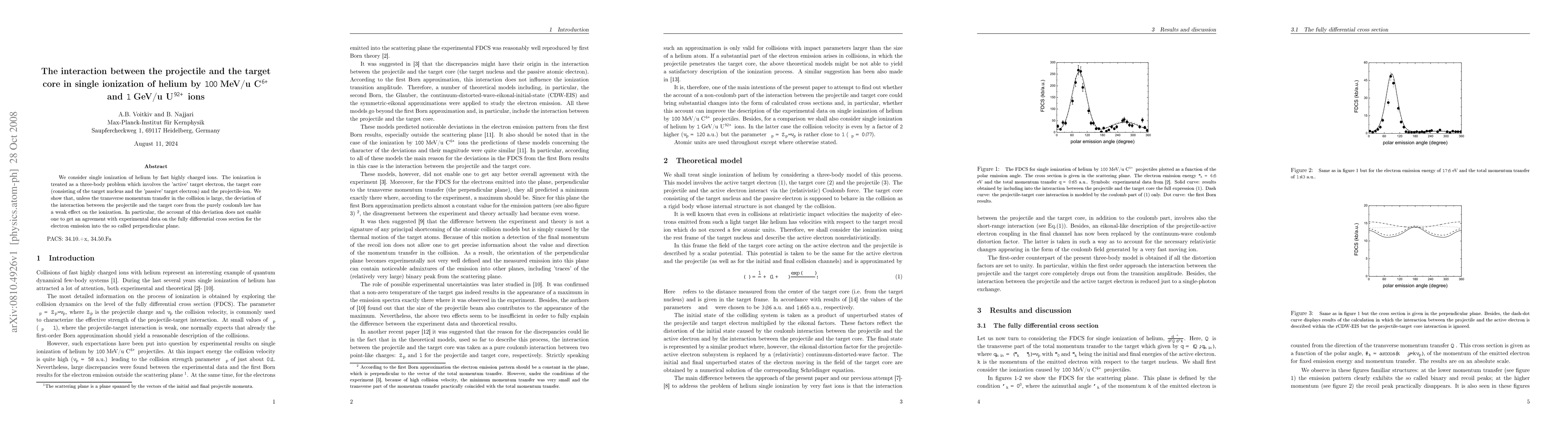 We consider single ionization of helium by fast highly charged ions. The ionization is treated as a three-body problem which involves the 'active' target electron, the target core (consisting of the target nucleus and the 'passive' target electron) and the projectile-ion. We show that, unless the transverse momentum transfer in the collision is large, the deviation of the interaction between the projectile and the target core from the purely coulomb law has a weak effect on the ionization. In particular, the account of this deviation does not enable one to get an agreement with experimental data on the fully differential cross section for the electron emission into the so called perpendicular plane.