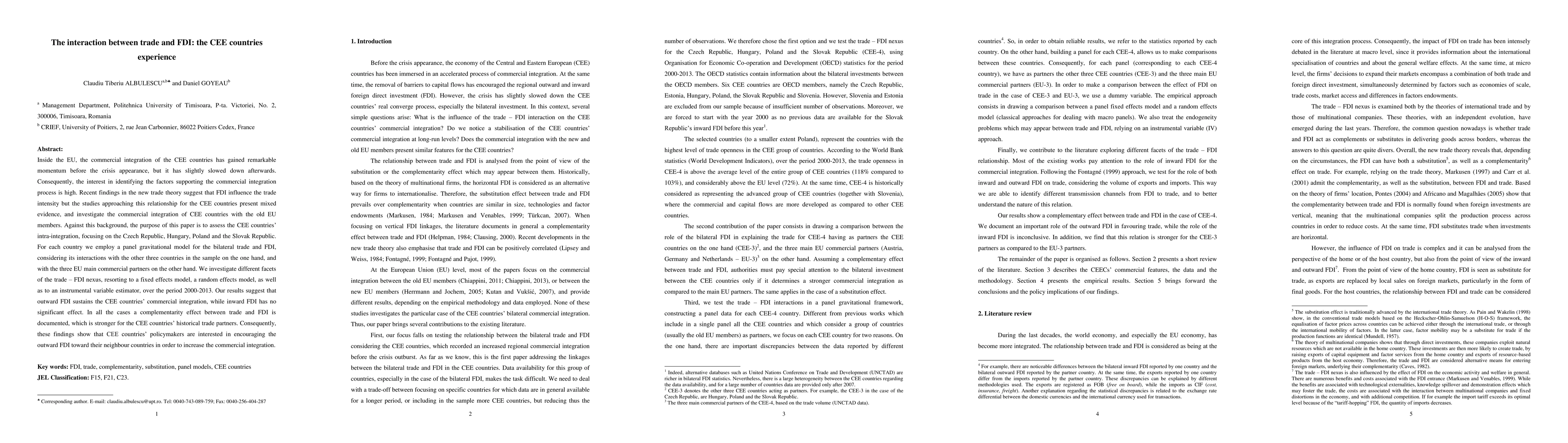 This paper examines the relationship between trade and Foreign Direct Investment (FDI) in Central and Eastern European (CEE) countries within the EU, focusing on the Czech Republic, Hungary, Poland, and Slovakia. The study finds that outward FDI supports commercial integration, while inward FDI has no significant effect, highlighting a complementary relationship between trade and FDI, especially with historical trade partners.