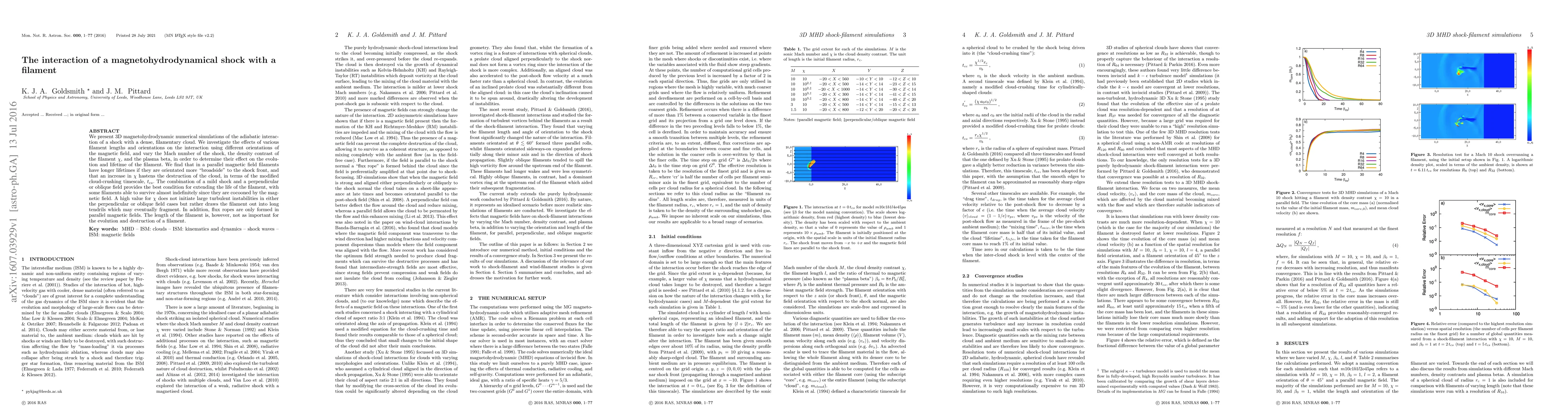 We present 3D magnetohydrodynamic numerical simulations of the adiabatic interaction of a shock with a dense, filamentary cloud. We investigate the effects of various filament lengths and orientations on the interaction using different orientations of the magnetic field, and vary the Mach number of the shock, the density contrast of the filament, and the plasma beta, in order to determine their effect on the evolution and lifetime of the filament. We find that in a parallel magnetic field filaments have longer lifetimes if they are orientated more 'broadside' to the shock front, and that an increase in the density contrast hastens the destruction of the cloud, in terms of the modified cloud-crushing time-scale, tcs. The combination of a mild shock and a perpendicular or oblique field provides the best condition for extending the life of the filament, with some filaments able to survive almost indefinitely since they are cocooned by the magnetic field. A high value for the density contrast does not initiate large turbulent instabilities in either the perpendicular or oblique field cases but rather draws the filament out into long tendrils which may eventually fragment. In addition, flux ropes are only formed in parallel magnetic fields. The length of the filament is, however, not as important for the evolution and destruction of a filament.