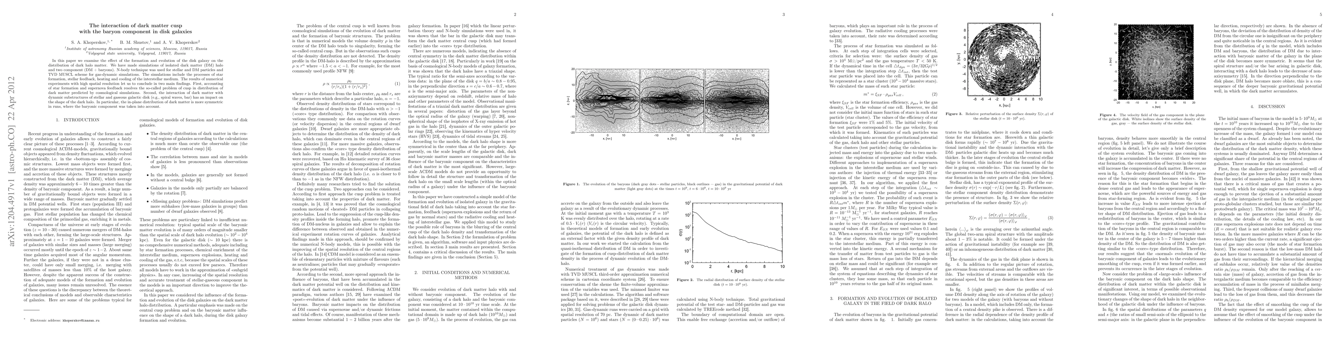 In this paper we examine the effect of the formation and evolution of the disk galaxy on the distribution of dark halo matter. We have made simulations of isolated dark matter (DM) halo and two component (DM + baryons). N-body technique was used for stellar and DM particles and TVD MUSCL scheme for gas-dynamic simulations. The simulations include the processes of star formation, stellar feedback, heating and cooling of the interstellar medium. The results of numerical experiments with high spatial resolution let us to conclude in two main findings. First, accounting of star formation and supernova feedback resolves the so-called problem of cusp in distribution of dark matter predicted by cosmological simulations. Second, the interaction of dark matter with dynamic substructures of stellar and gaseous galactic disk (e.g., spiral waves, bar) has an impact on the shape of the dark halo. In particular, the in-plane distribution of dark matter is more symmetric in runs, where the baryonic component was taken into account.
