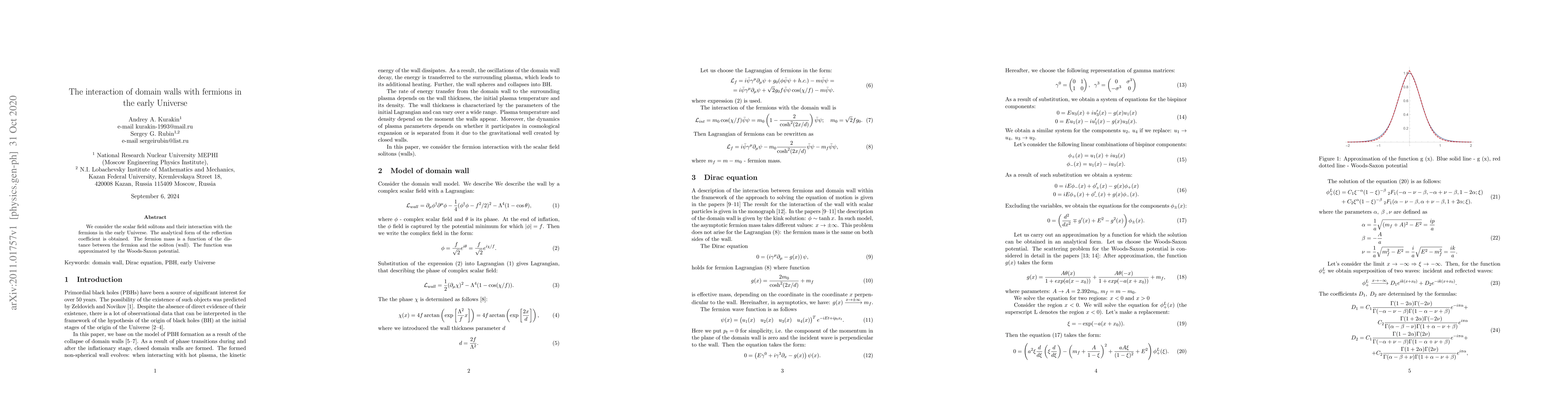 Researchers studied how domain walls interact with fermions in the early Universe, finding that the fermion mass changes with distance from the wall, approximated by a Woods-Saxon potential.