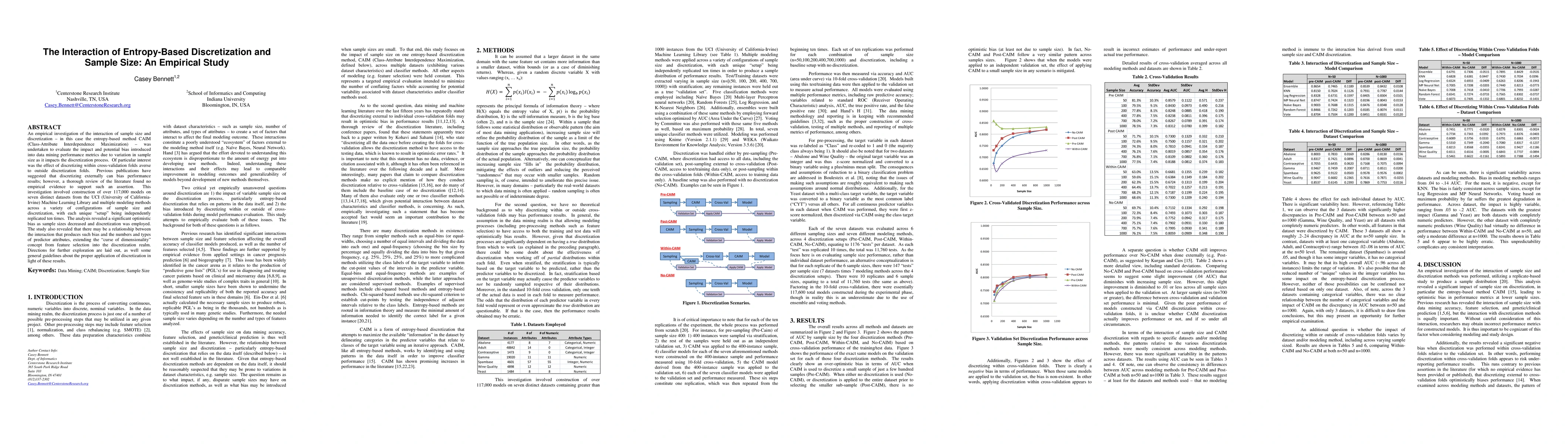 An empirical investigation of the interaction of sample size and discretization - in this case the entropy-based method CAIM (Class-Attribute Interdependence Maximization) - was undertaken to evaluate the impact and potential bias introduced into data mining performance metrics due to variation in sample size as it impacts the discretization process. Of particular interest was the effect of discretizing within cross-validation folds averse to outside discretization folds. Previous publications have suggested that discretizing externally can bias performance results; however, a thorough review of the literature found no empirical evidence to support such an assertion. This investigation involved construction of over 117,000 models on seven distinct datasets from the UCI (University of California-Irvine) Machine Learning Library and multiple modeling methods across a variety of configurations of sample size and discretization, with each unique "setup" being independently replicated ten times. The analysis revealed a significant optimistic bias as sample sizes decreased and discretization was employed. The study also revealed that there may be a relationship between the interaction that produces such bias and the numbers and types of predictor attributes, extending the "curse of dimensionality" concept from feature selection into the discretization realm. Directions for further exploration are laid out, as well some general guidelines about the proper application of discretization in light of these results.