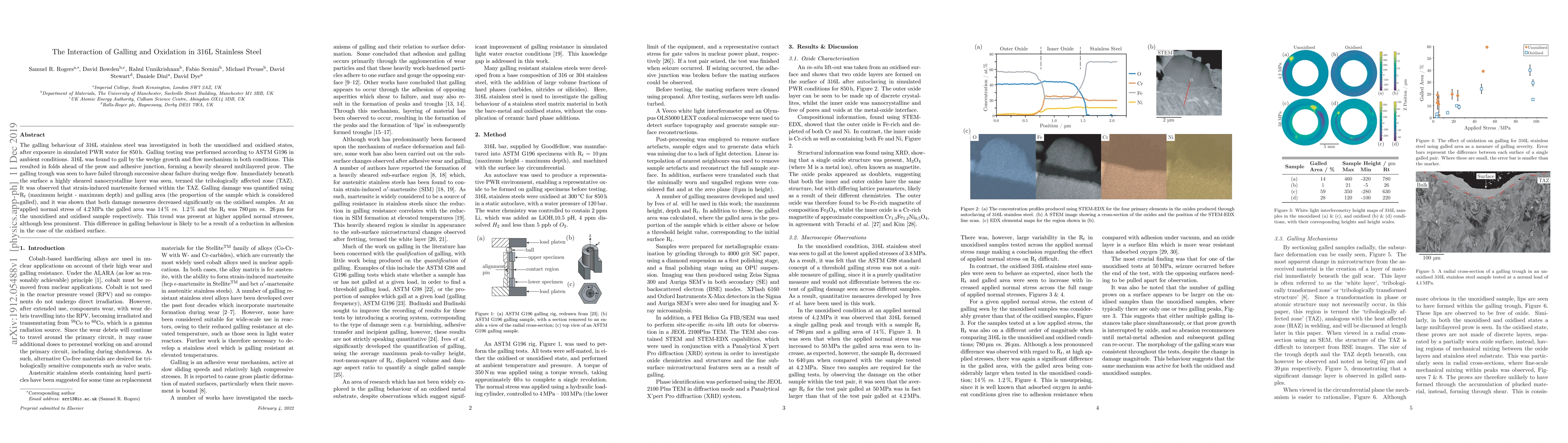 Research investigates galling behavior in 316L stainless steel under oxidized conditions, revealing a reduction in damage measures compared to unoxidized states due to reduced adhesion.