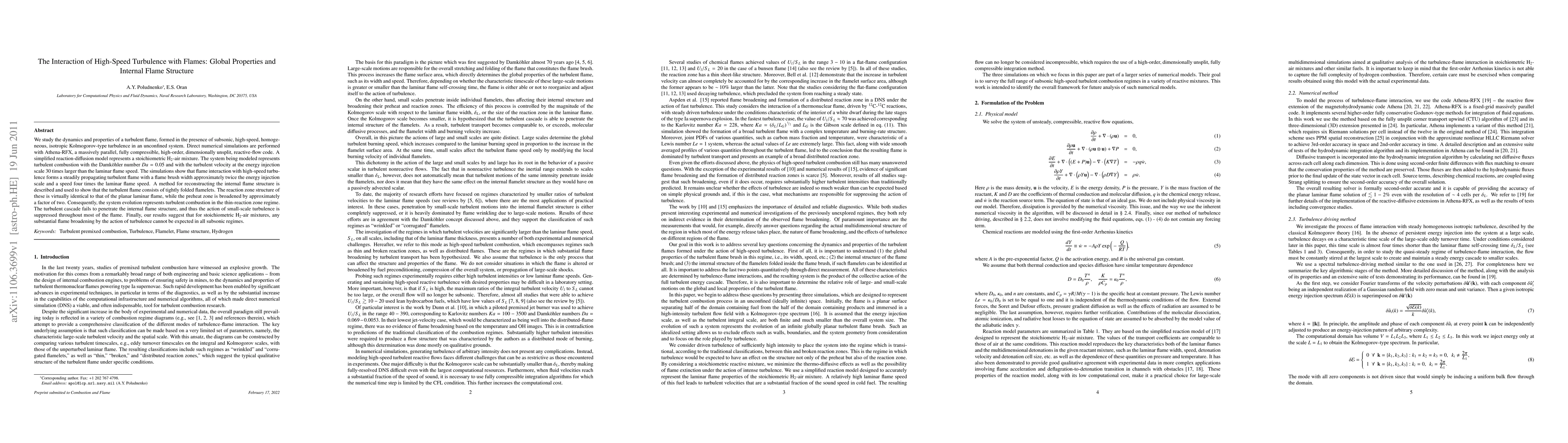 This study uses direct numerical simulations to analyze the interaction of high-speed turbulence with flames in a subsonic, Kolmogorov-type turbulent environment, revealing a turbulent flame with a width twice the energy injection scale and a speed four times the laminar flame speed. The internal flame structure consists of tightly folded flamelets, with the reaction zone similar to planar laminar flames but a preheat zone broadened by a factor of two.