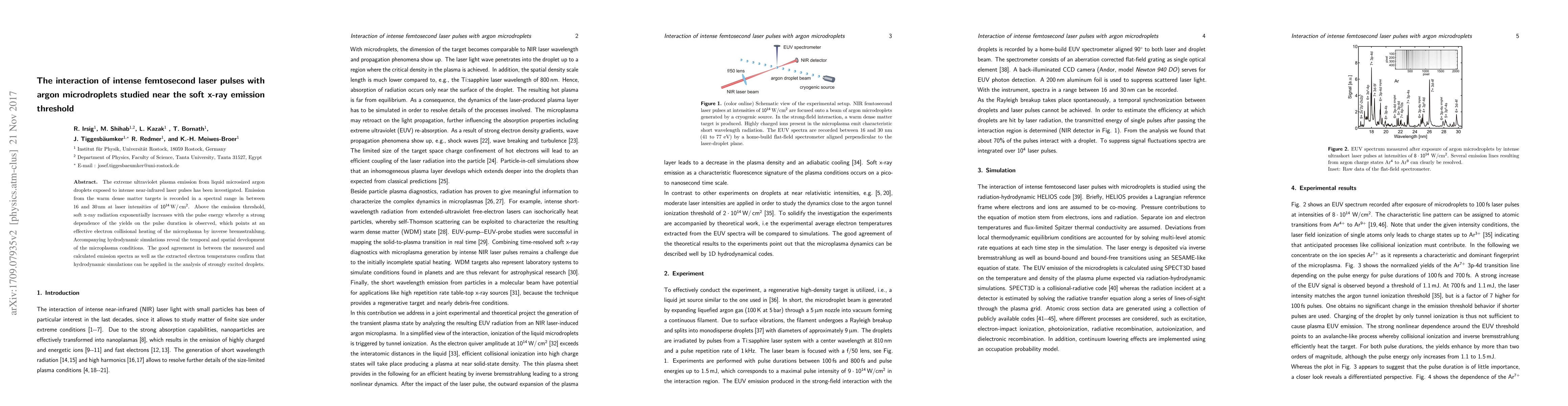 This study investigates the interaction of intense femtosecond laser pulses with argon microdroplets, focusing on soft x-ray emission near the threshold. The research finds that soft x-ray radiation increases exponentially with pulse energy, indicating effective electron collisional heating, and validates hydrodynamic simulations for analyzing such interactions.