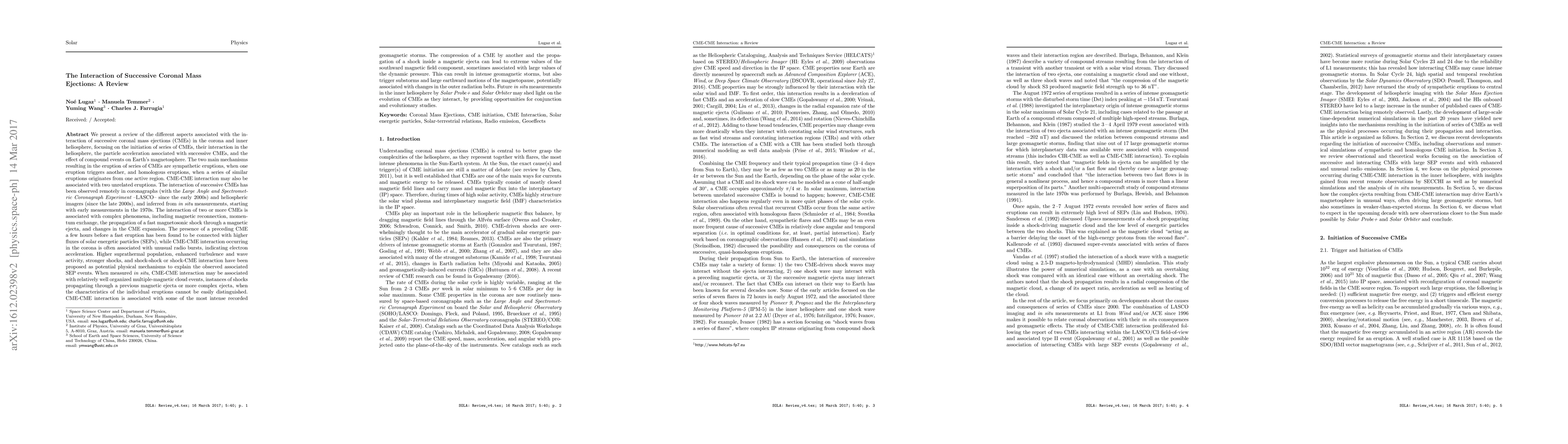 We present a review of the different aspects associated with the interaction of successive CMEs in the corona and inner heliosphere, focusing on the initiation of series of CMEs, their interaction in the heliosphere, the particle acceleration associated with successive CMEs, and the effect of compound events on Earth's magnetosphere. The two main mechanisms resulting in the eruption of series of CMEs are sympathetic eruptions and homologous eruptions. The interaction of successive CMEs has been observed remotely in coronagraphs and heliospheric imagers, and inferred from in situ measurements. It is associated with magnetic reconnection, momentum exchange, the propagation of a fast magnetosonic shock through a magnetic ejecta and changes in CME expansion. The presence of a CME a few hours before a fast eruption is connected with higher fluxes of SEPs, while CME-CME interaction occurring in the corona is often associated with unusual radio bursts. Higher suprathermal population, enhanced turbulence and wave activity, stronger shocks, and shock-shock or shock-CME interaction have been proposed as physical mechanisms to explain these SEP events. When measured in situ, CME-CME interaction may be associated with relatively well organized multiple-magnetic cloud events, instances of shocks propagating through a previous magnetic ejecta or more complex ejecta. The compression of a CME by another and the propagation of a shock inside a magnetic ejecta can lead to extreme values of the southward magnetic field, sometimes associated with large values of the dynamic pressure. This can result in intense geomagnetic storms, but also trigger substorms and large earthward motions of the magnetopause, potentially associated with changes in the outer radiation belts. Future measurements by Solar Probe+ and Solar Orbiter may shed light on the evolution of CMEs as they interact.