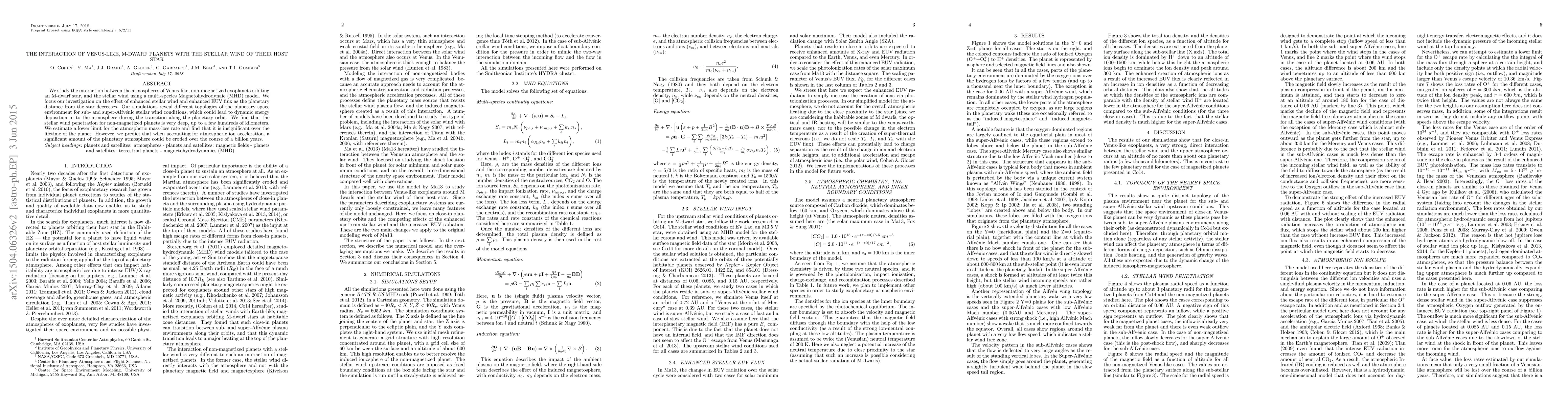 This paper investigates the interaction between Venus-like, non-magnetized exoplanets orbiting M-dwarf stars and their stellar winds using MHD models. The study finds significant atmospheric erosion due to stellar wind penetration and ion acceleration, predicting substantial atmospheric loss over a billion years.