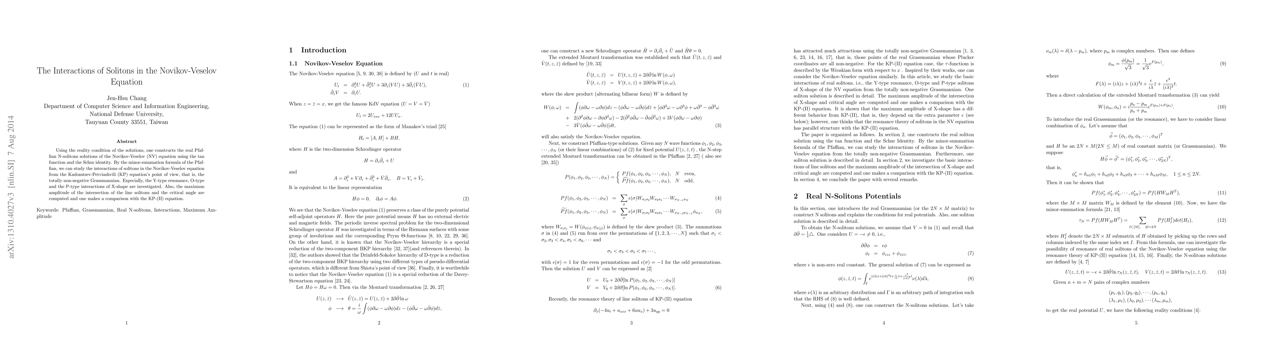This paper explores the interactions of N-solitons in the Novikov-Veselov equation through the construction of real Pfaffian N-soliton solutions using the $\tan$ function and Schur identity. The study investigates Y-shape resonance, O-type, and P-type interactions, comparing results with the Kadomtsev-Petviashvili (KP) equation's totally non-negative Grassmannian framework.