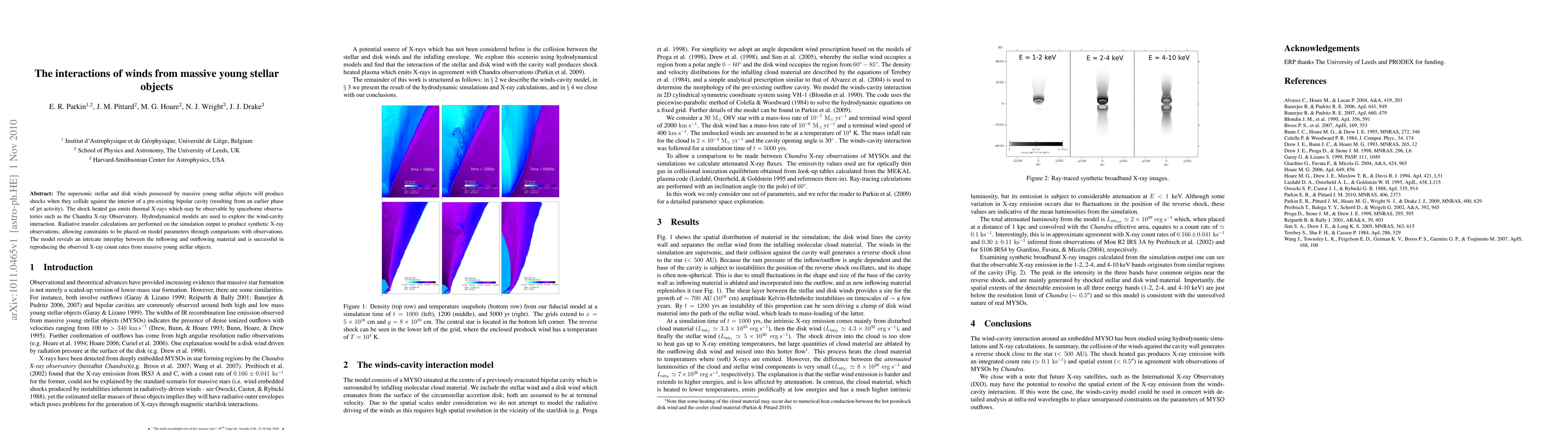 The supersonic stellar and disk winds possessed by massive young stellar objects will produce shocks when they collide against the interior of a pre-existing bipolar cavity (resulting from an earlier phase of jet activity). The shock heated gas emits thermal X-rays which may be observable by spaceborne observa- tories such as the Chandra X-ray Observatory. Hydrodynamical models are used to explore the wind-cavity interaction. Radiative transfer calculations are performed on the simulation output to produce synthetic X-ray observations, allowing constraints to be placed on model parameters through comparisons with observations. The model reveals an intricate interplay between the inflowing and outflowing material and is successful in reproducing the observed X-ray count rates from massive young stellar objects.