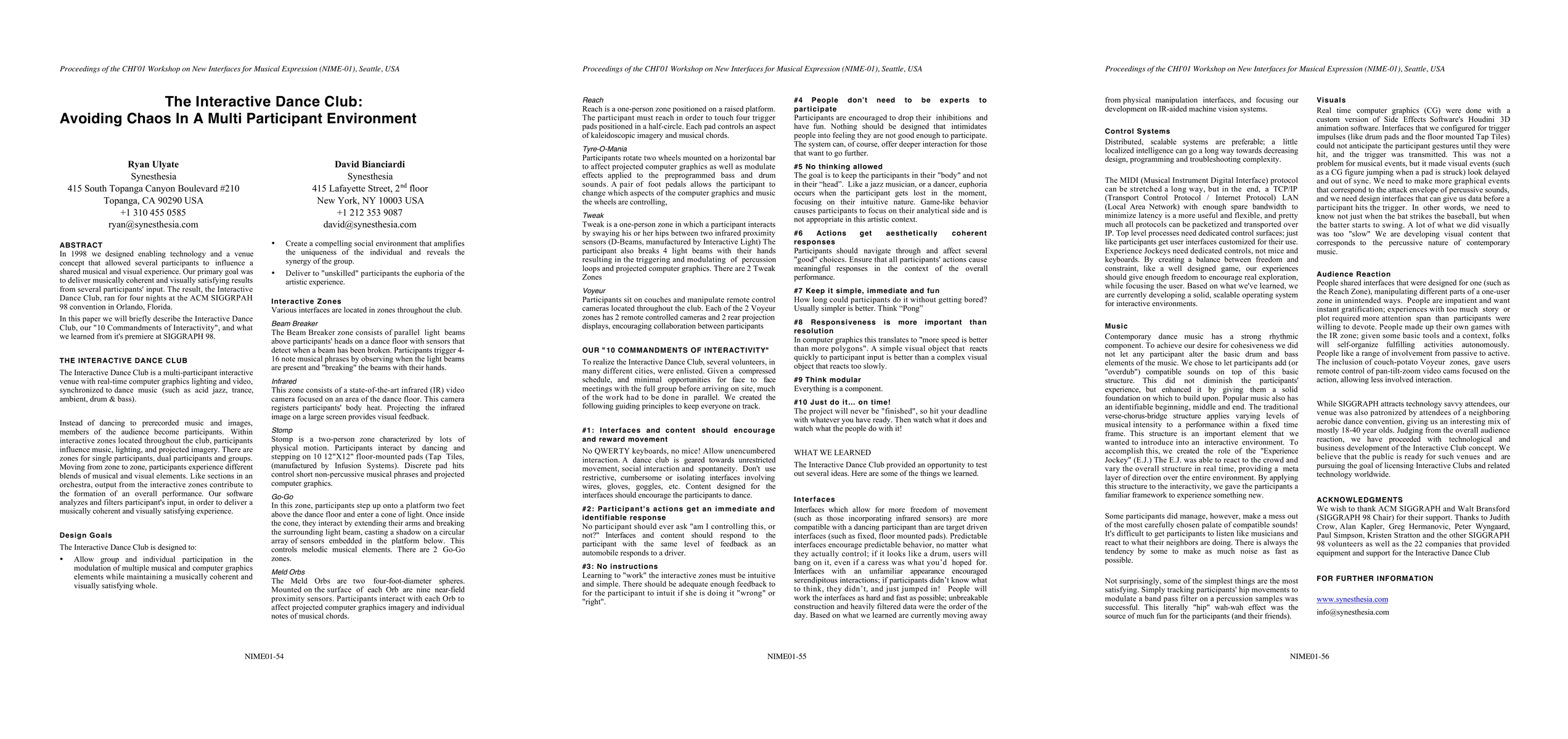 The Interactive Dance Club enabled multiple participants to collaboratively influence a shared musical and visual experience, achieving coherent and satisfying results. Lessons from its four-night run at the 1998 ACM SIGGRAPH convention highlighted key principles for successful multi-participant interactivity.