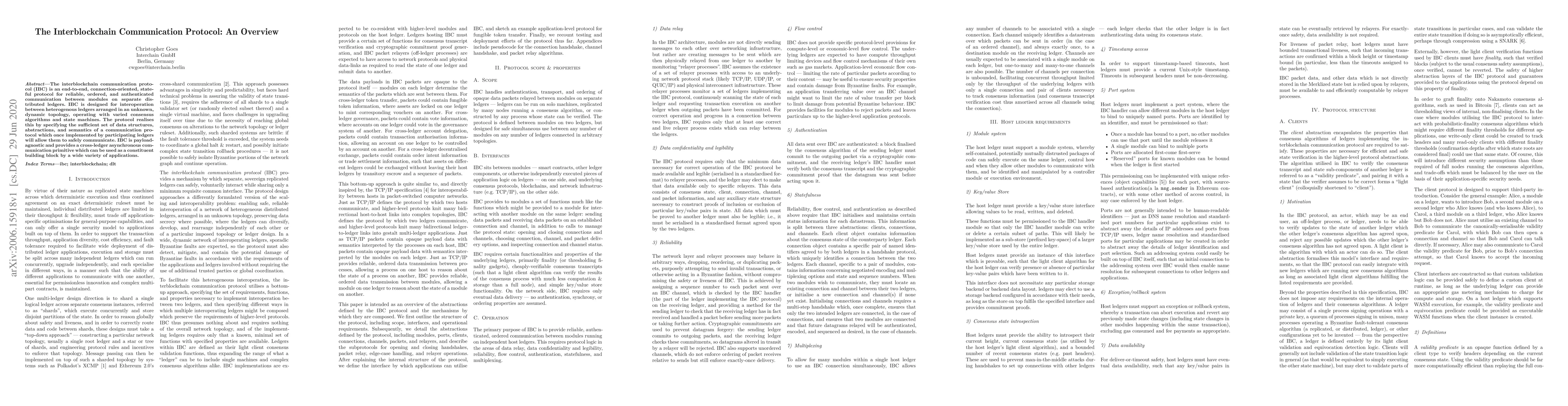 The interblockchain communication protocol (IBC) is an end-to-end, connection-oriented, stateful protocol for reliable, ordered, and authenticated communication between modules on separate distributed ledgers. IBC is designed for interoperation between heterogenous ledgers arranged in an unknown, dynamic topology, operating with varied consensus algorithms and state machines. The protocol realises this by specifying the sufficient set of data structures, abstractions, and semantics of a communication protocol which once implemented by participating ledgers will allow them to safely communicate. IBC is payload-agnostic and provides a cross-ledger asynchronous communication primitive which can be used as a constituent building block by a wide variety of applications.