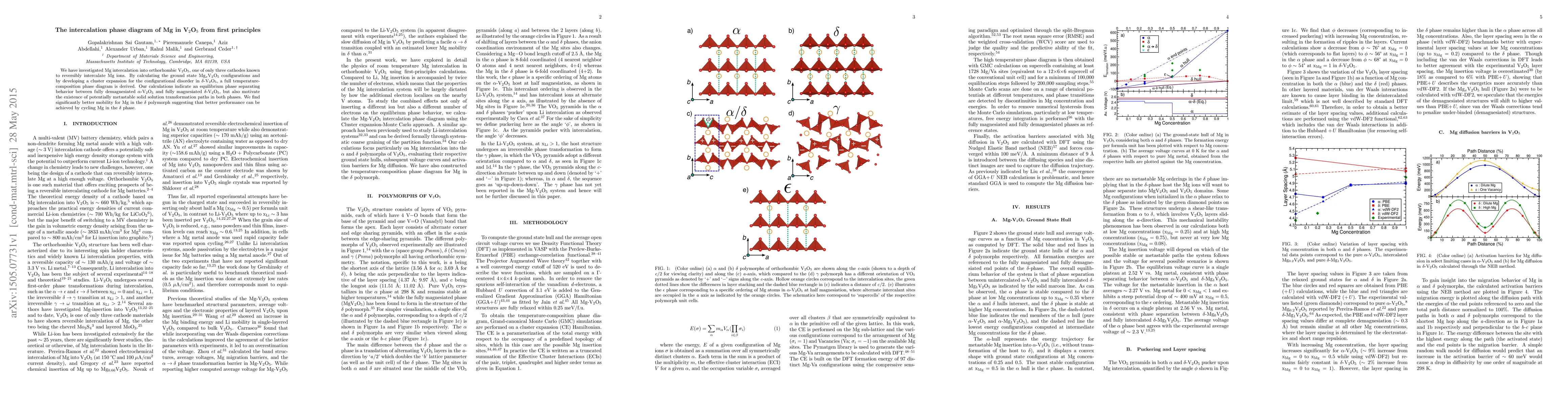 We have investigated Mg intercalation into orthorhombic V$_2$O$_5$, one of only three cathodes known to reversibly intercalate Mg ions. By calculating the ground state Mg$_x$V$_2$O$_5$ configurations and by developing a cluster expansion for the configurational disorder in $\delta$-V$_2$O$_5$, a full temperature-composition phase diagram is derived. Our calculations indicate an equilibrium phase separating behavior between fully demagnesiated $\alpha$-V$_2$O$_5$ and fully magnesiated $\delta$-V$_2$O$_5$, but also motivate the existence of potentially metastable solid solution transformation paths in both phases. We find significantly better mobility for Mg in the $\delta$ polymorph suggesting that better performance can be achieved by cycling Mg in the $\delta$ phase.