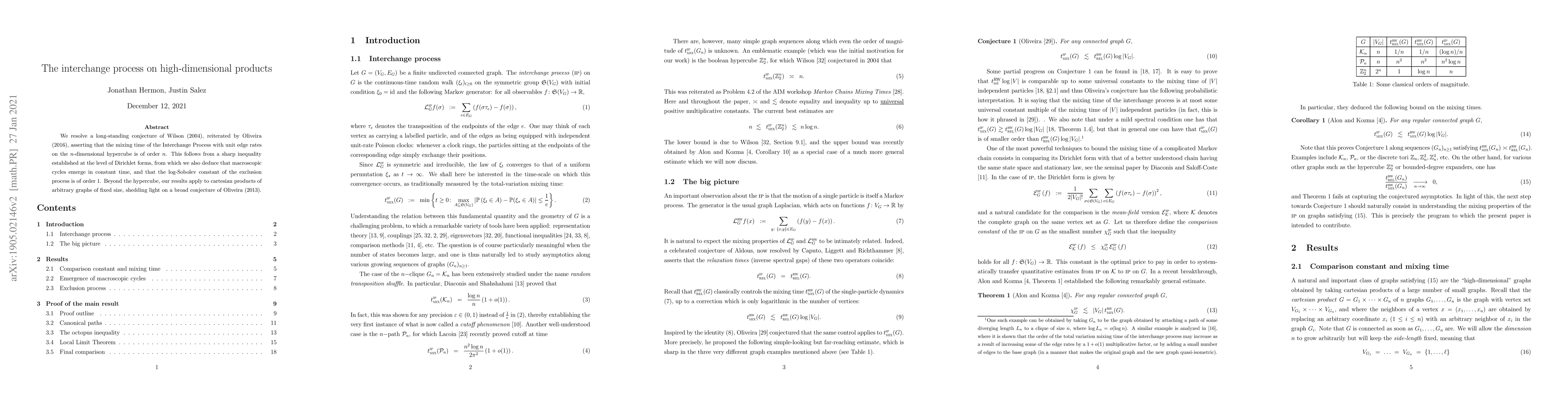 We resolve a long-standing conjecture of Wilson (2004), reiterated by Oliveira (2016), asserting that the mixing-time of the unit-rate Interchange Process on the $n$-dimensional hypercube is of order $n$. This follows from a sharp inequality established at the level of Dirichlet forms, from which we also deduce that macroscopic cycles emerge in constant time, and that the log-Sobolev constant of the exclusion process is of order $1$. Beyond the hypercube, our results apply to cartesian products of arbitrary graphs of fixed size, shedding light on a broad conjecture of Oliveira (2013).