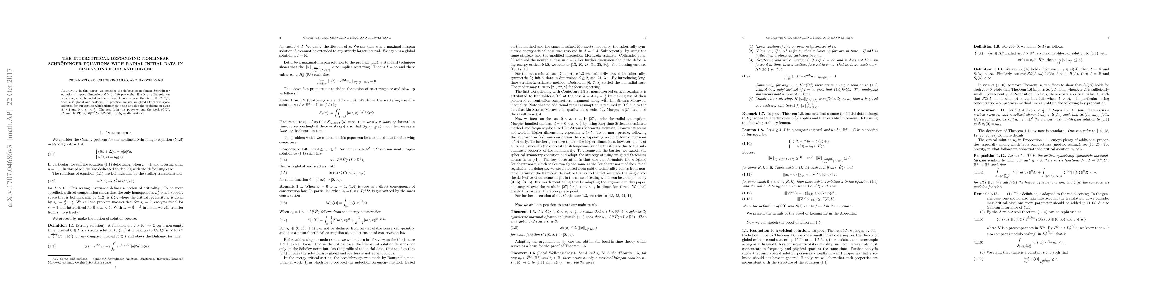 space dimensions $d\geq 4$. We prove that if $u$ is a radial solution which is