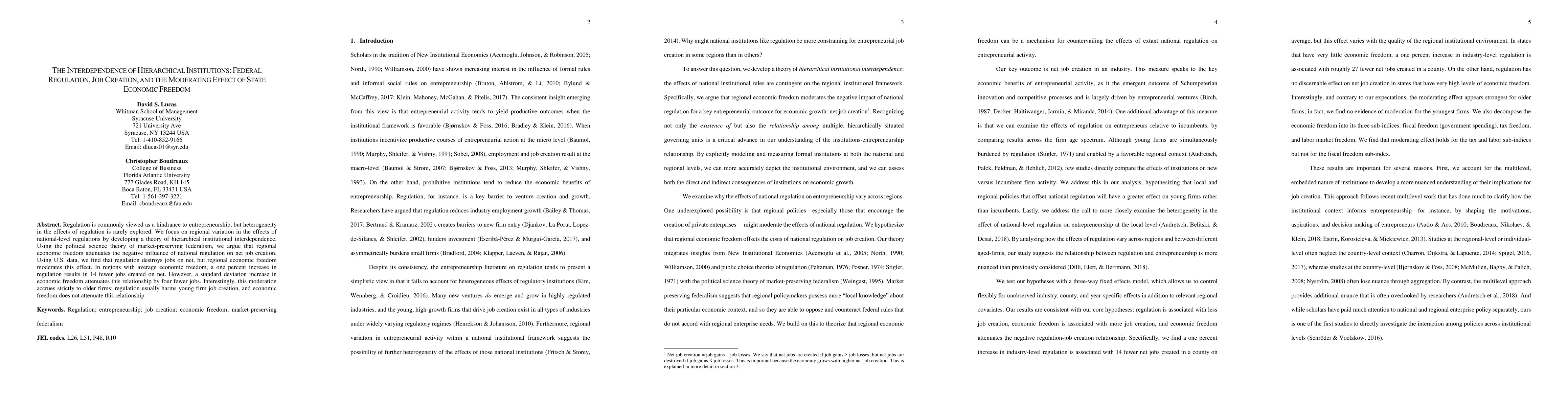 Regulation is commonly viewed as a hindrance to entrepreneurship, but heterogeneity in the effects of regulation is rarely explored. We focus on regional variation in the effects of national-level regulations by developing a theory of hierarchical institutional interdependence. Using the political science theory of market-preserving federalism, we argue that regional economic freedom attenuates the negative influence of national regulation on net job creation. Using U.S. data, we find that regulation destroys jobs on net, but regional economic freedom moderates this effect. In regions with average economic freedom, a one percent increase in regulation results in 14 fewer jobs created on net. However, a standard deviation increase in economic freedom attenuates this relationship by four fewer jobs. Interestingly, this moderation accrues strictly to older firms; regulation usually harms young firm job creation, and economic freedom does not attenuate this relationship.