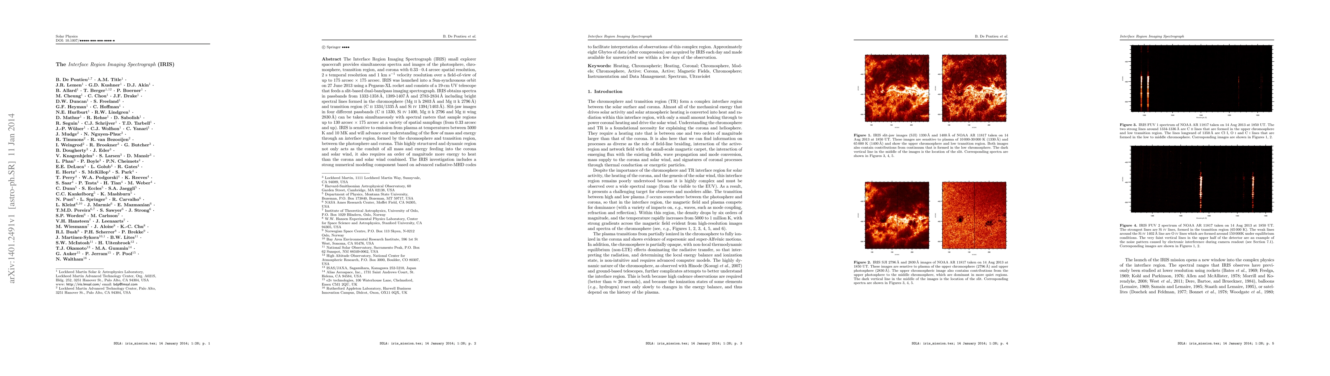 The Interface Region Imaging Spectrograph (IRIS) small explorer spacecraft provides simultaneous spectra and images of the photosphere, chromosphere, transition region, and corona with 0.33-0.4 arcsec spatial resolution, 2 s temporal resolution and 1 km/s velocity resolution over a field-of-view of up to 175 arcsec x 175 arcsec. IRIS was launched into a Sun-synchronous orbit on 27 June 2013 using a Pegasus-XL rocket and consists of a 19-cm UV telescope that feeds a slit-based dual-bandpass imaging spectrograph. IRIS obtains spectra in passbands from 1332-1358, 1389-1407 and 2783-2834 Angstrom including bright spectral lines formed in the chromosphere (Mg II h 2803 Angstrom and Mg II k 2796 Angstrom) and transition region (C II 1334/1335 Angstrom and Si IV 1394/1403 Angstrom). Slit-jaw images in four different passbands (C II 1330, Si IV 1400, Mg II k 2796 and Mg II wing 2830 Angstrom) can be taken simultaneously with spectral rasters that sample regions up to 130 arcsec x 175 arcsec at a variety of spatial samplings (from 0.33 arcsec and up). IRIS is sensitive to emission from plasma at temperatures between 5000 K and 10 MK and will advance our understanding of the flow of mass and energy through an interface region, formed by the chromosphere and transition region, between the photosphere and corona. This highly structured and dynamic region not only acts as the conduit of all mass and energy feeding into the corona and solar wind, it also requires an order of magnitude more energy to heat than the corona and solar wind combined. The IRIS investigation includes a strong numerical modeling component based on advanced radiative-MHD codes to facilitate interpretation of observations of this complex region. Approximately eight Gbytes of data (after compression) are acquired by IRIS each day and made available for unrestricted use within a few days of the observation.