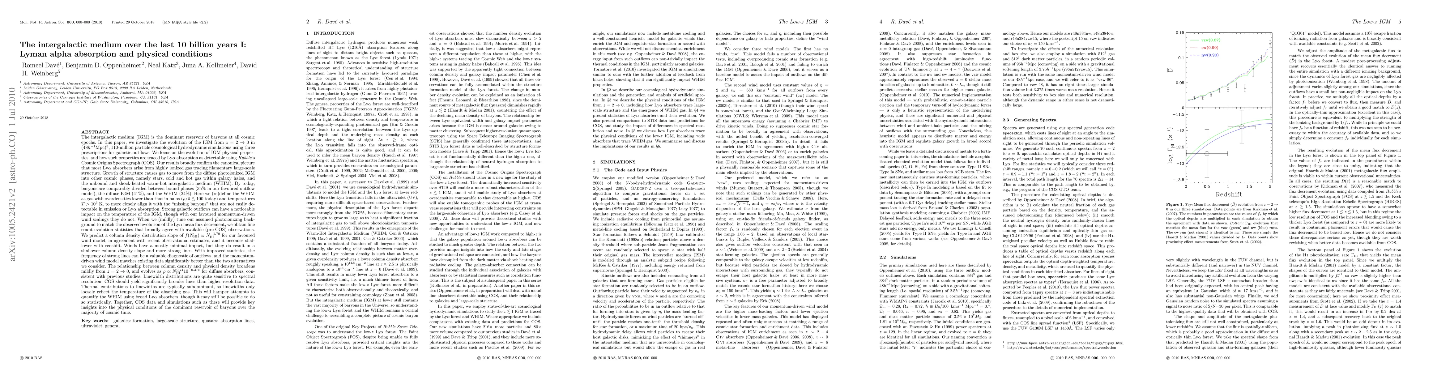 This paper investigates the evolution of the intergalactic medium (IGM) from z=2 to z=0 using cosmological simulations, focusing on the physical properties traced by Lyman alpha absorption. It finds that most Ly-alpha absorbers arise from highly ionized gas in filamentary structures, and predicts a column density distribution slope of -1.70, aligning with recent observations.