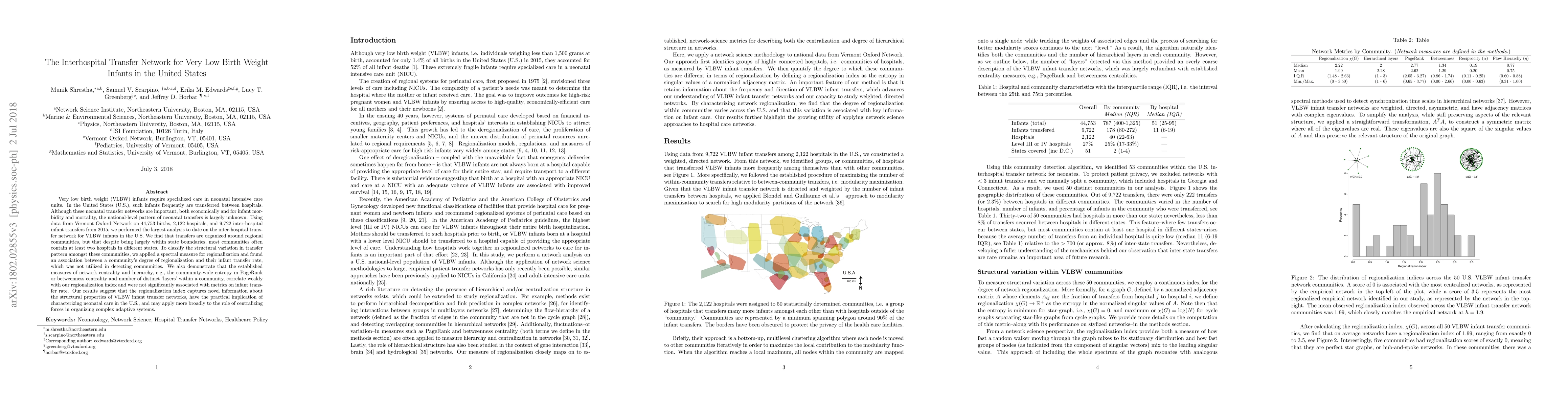 The study analyzed 44,753 births and found that interhospital transfers of very low birth weight infants in the US are organized around regional communities, with at least two hospitals in different states often involved.